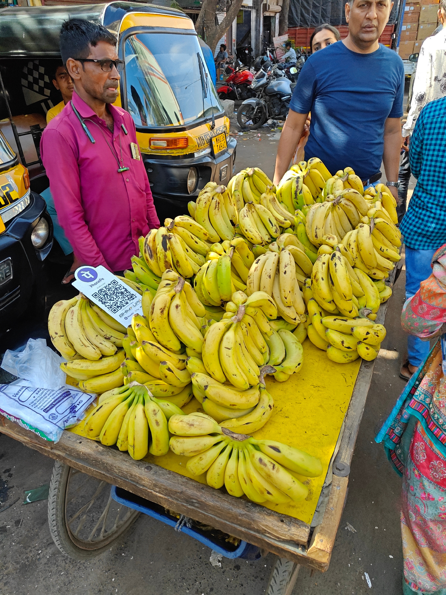 The image shows a street banana vendor in Mumbai, India. The vendor, a middle-aged man with glasses and a pink shirt, stands behind a cart piled high with bunches of ripe bananas. A PhonePe QR code pa…read more