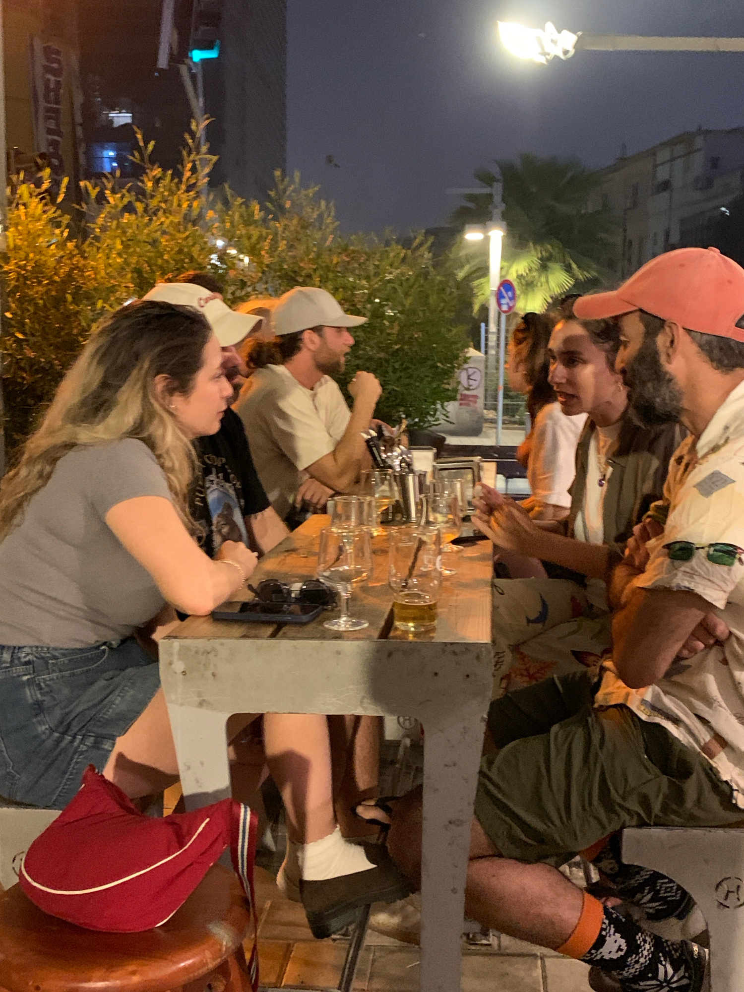 A medium shot depicts a group of people seated at a long communal table outdoors, possibly at a restaurant or bar. The setting appears to be in Tel Aviv, Israel, based on architectural styles. The sky…read more