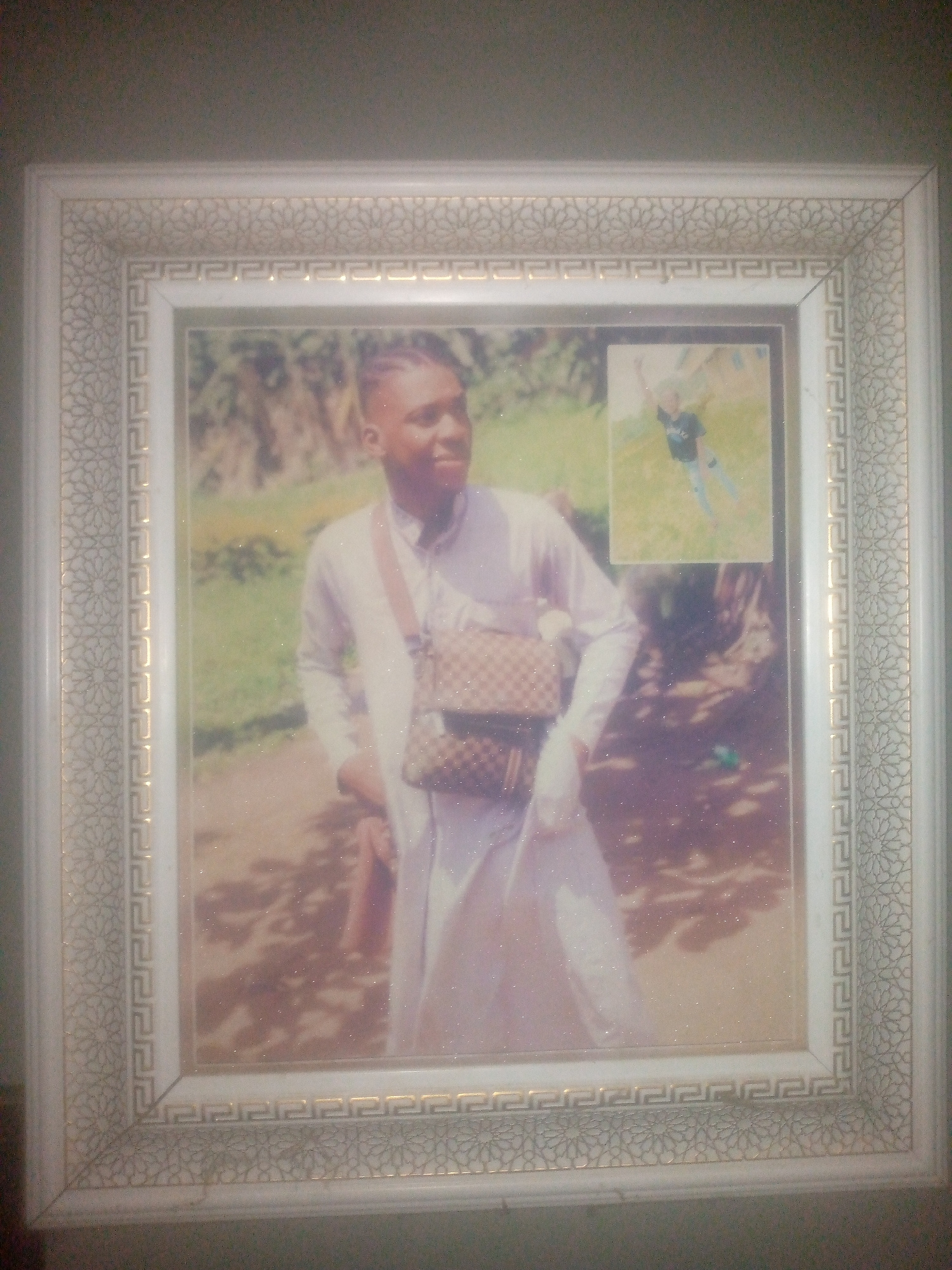 A framed photograph is centered in the image. The frame is white with a repeating gold Greek key pattern and a floral pattern around the edges. Inside the frame is a photo of a person with short braid…read more