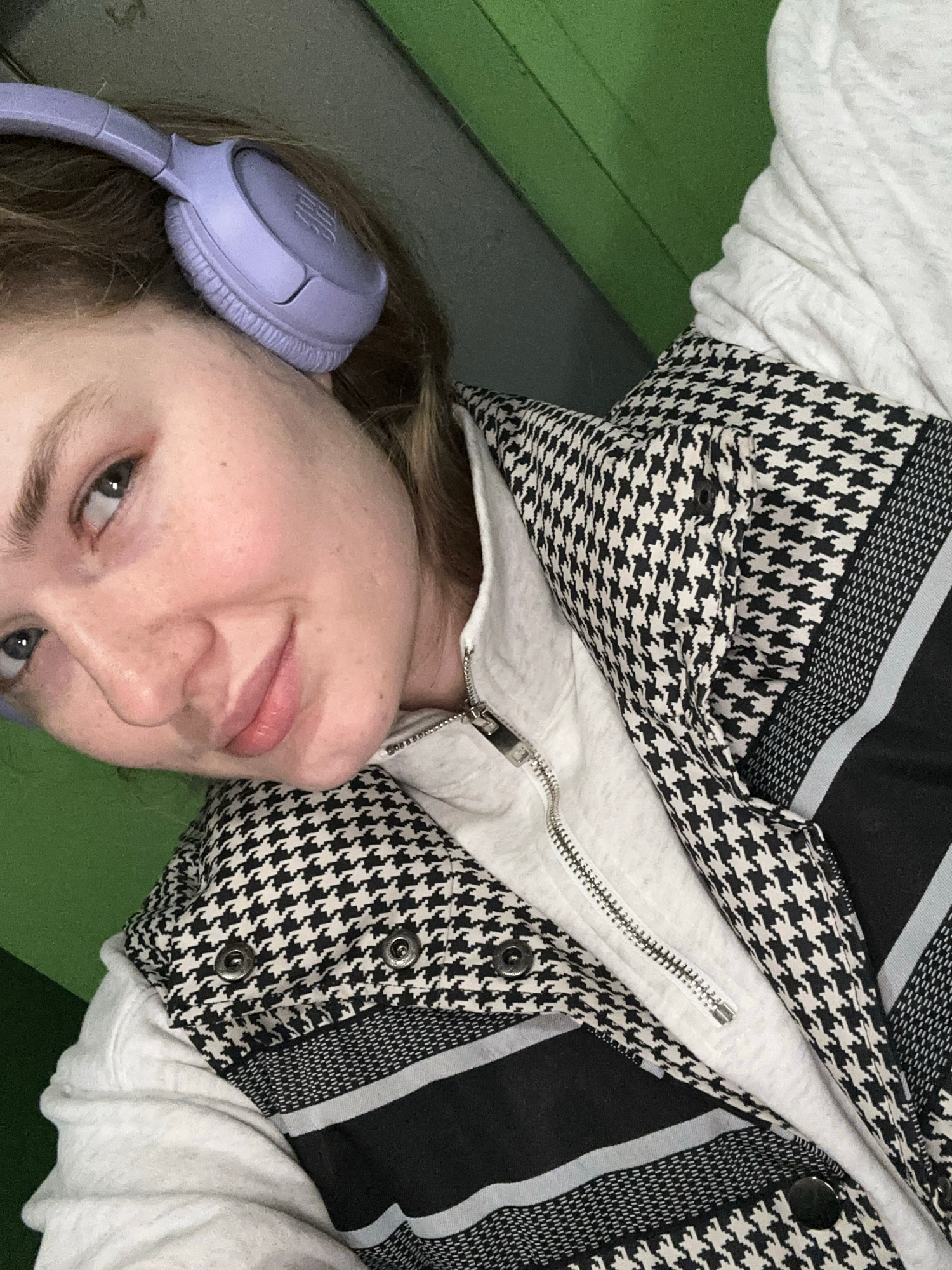 A woman with headphones is lying down in Kazan, Russia. She is wearing a white sweatshirt and a black and white houndstooth patterned vest with a zipper. The background is green and grey.