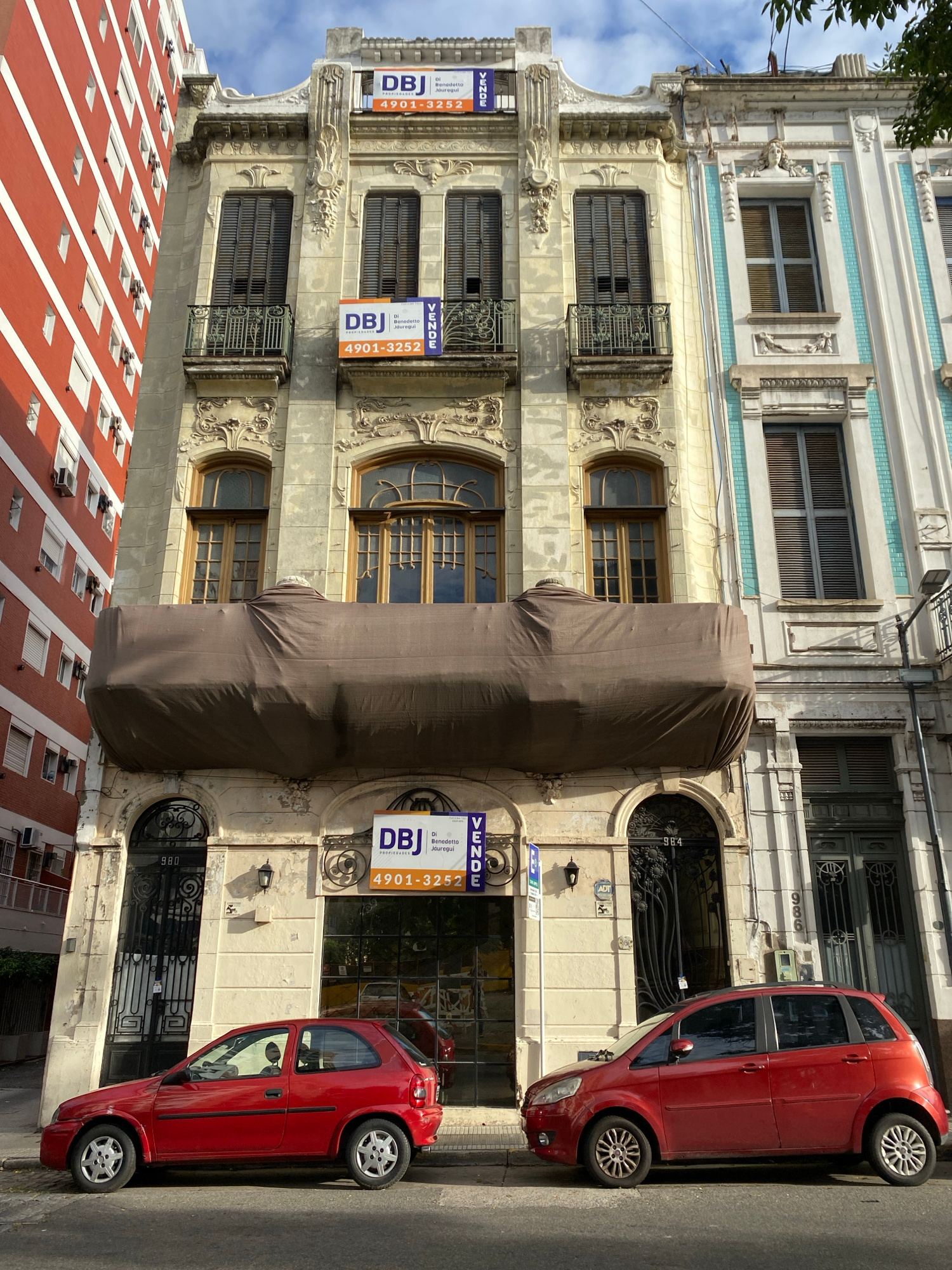 The image depicts a street scene in Buenos Aires, Argentina, featuring a building with ornate architectural details. The building has three visible stories, with windows and balconies on each level. T…read more