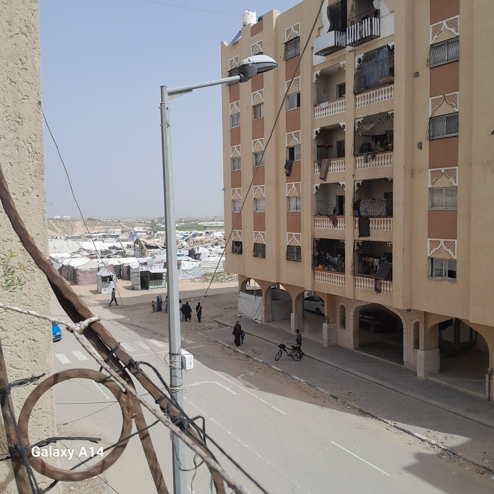 The image shows a view from a high vantage point in Khan Yunis, Palestinian Territory, overlooking a street and a refugee camp. The main building is a five-story apartment complex with symmetrical win…read more