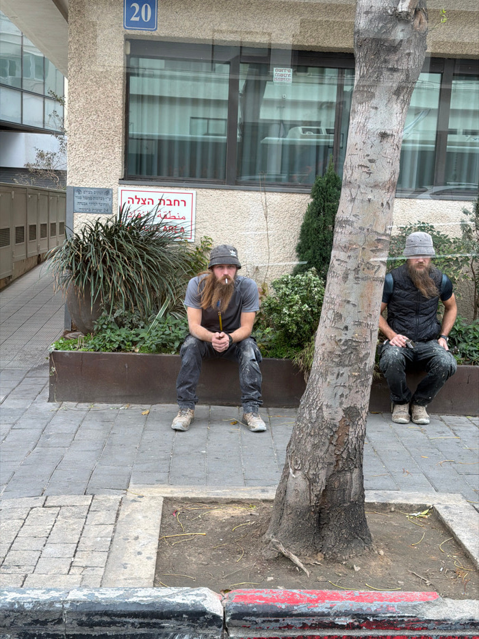 This image depicts an outdoor urban scene in Tel-Aviv, Israel, directly in front of a building marked with the number 20 on a blue plaque. Two men, both with long reddish-brown beards and wearing grey…read more