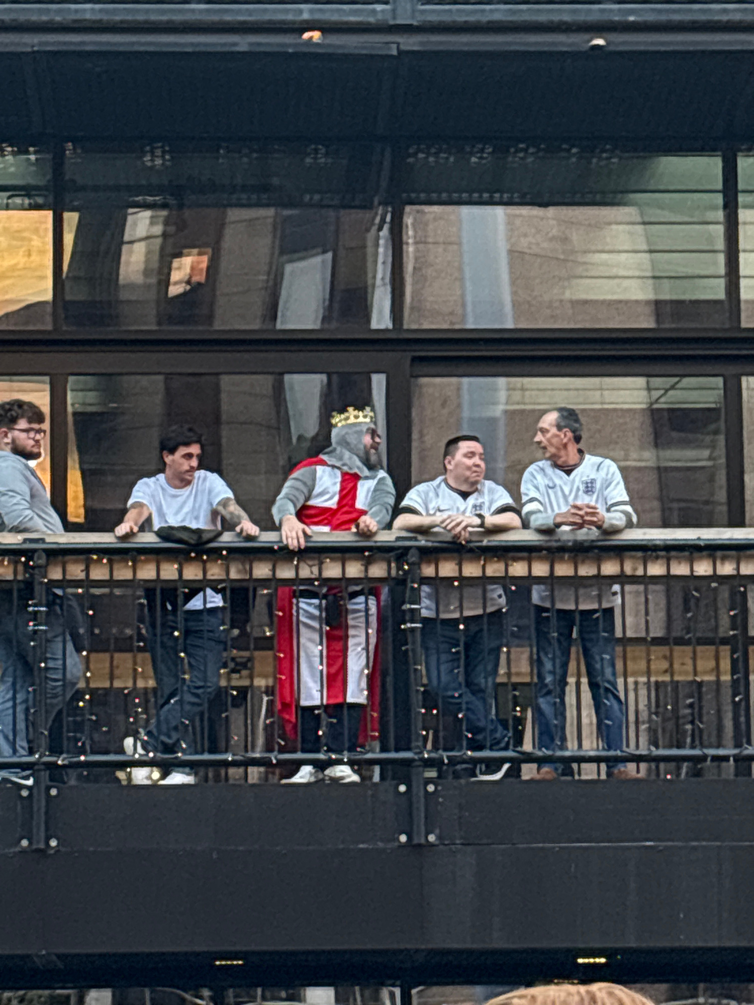 On a balcony overlooking a cityscape, five men are visible. The balcony's railing is black, and strings of tiny lights are interwoven through it. Behind the balcony is a modern building with large, re…read more