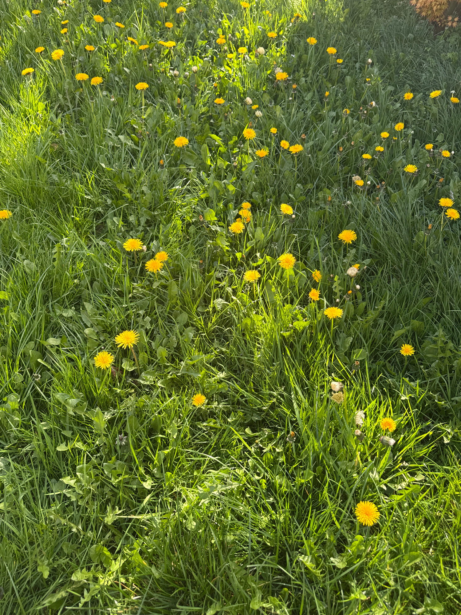 The image shows a patch of green grass interspersed with numerous yellow dandelions. The scene appears to be in a field or lawn in Desborough, United Kingdom, based on the characteristics of the grass…read more
