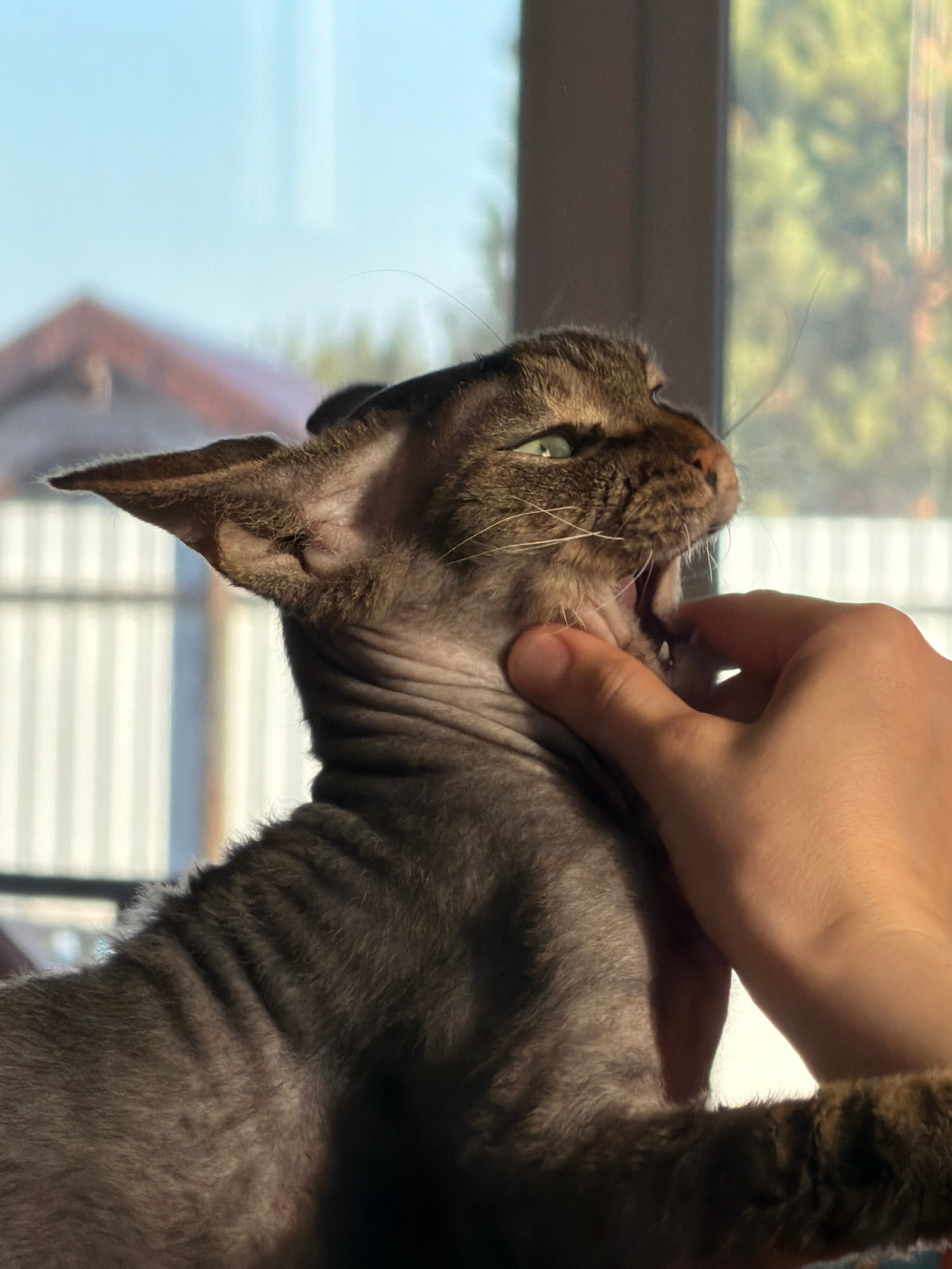 A brown Devon Rex cat is being held by a human hand. The cat's head is tilted back, revealing its teeth. The cat is positioned in front of a window. The location is not identifiable as Prikamskii, Rus…read more