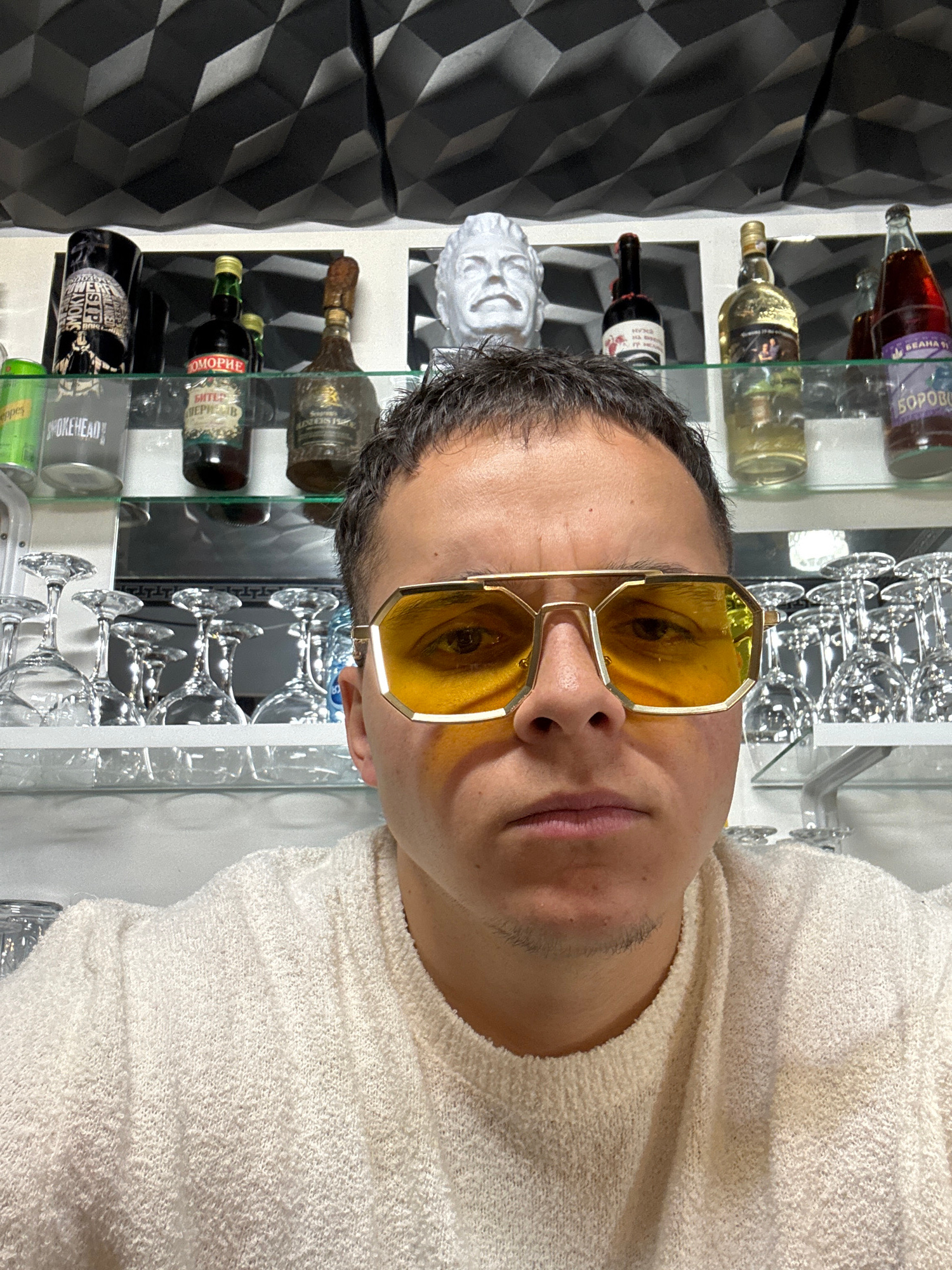 A person with short dark hair and wearing yellow sunglasses is posing for a photograph. They are wearing a white, textured sweater or shirt. Behind them is a glass-fronted shelf containing bottles of…read more