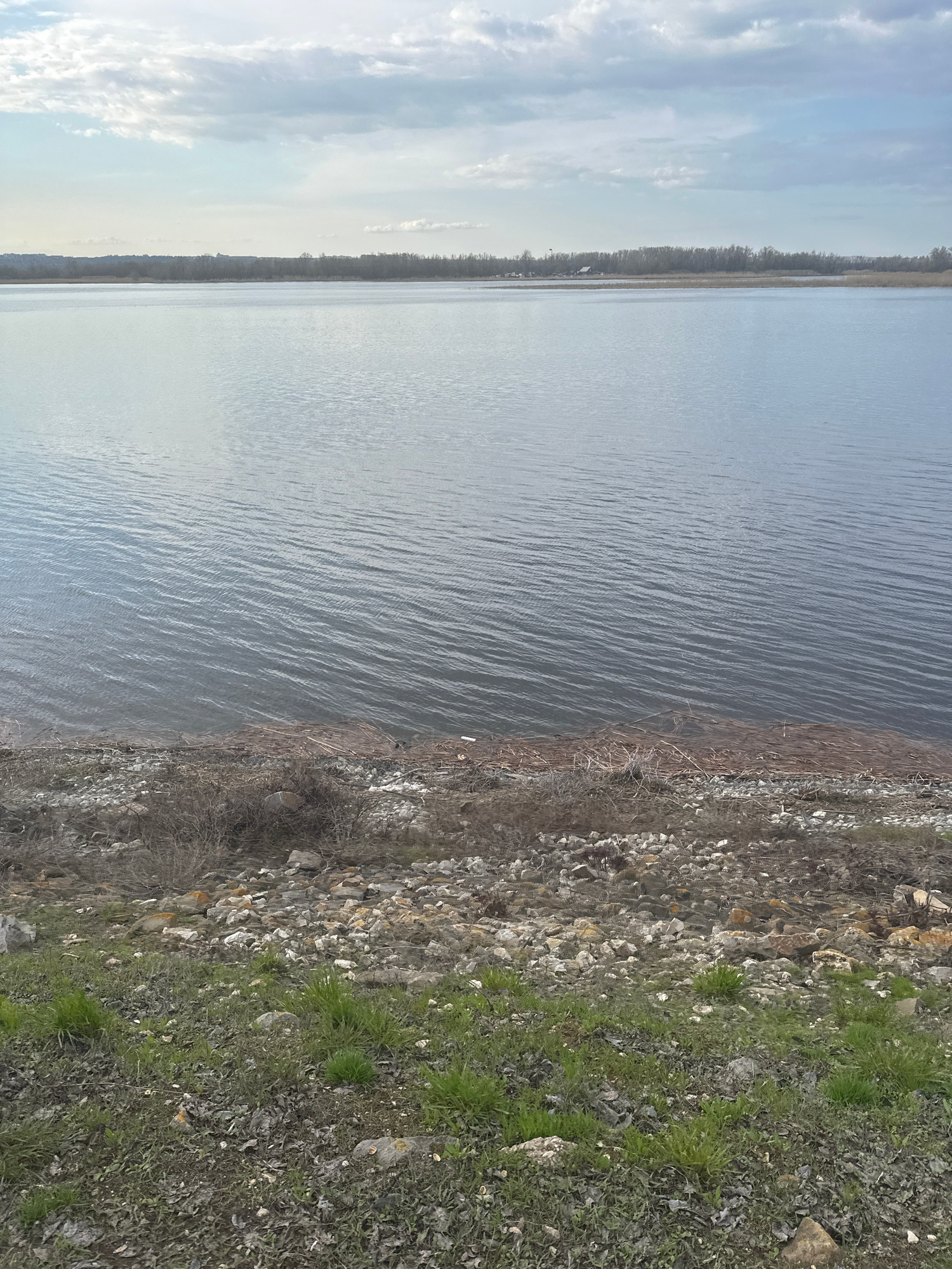 The image shows a body of water, likely the Volga River, with a shoreline covered in rocks and sparse green vegetation. The sky is partially cloudy. The location is likely near Engels, Russia, based o…read more