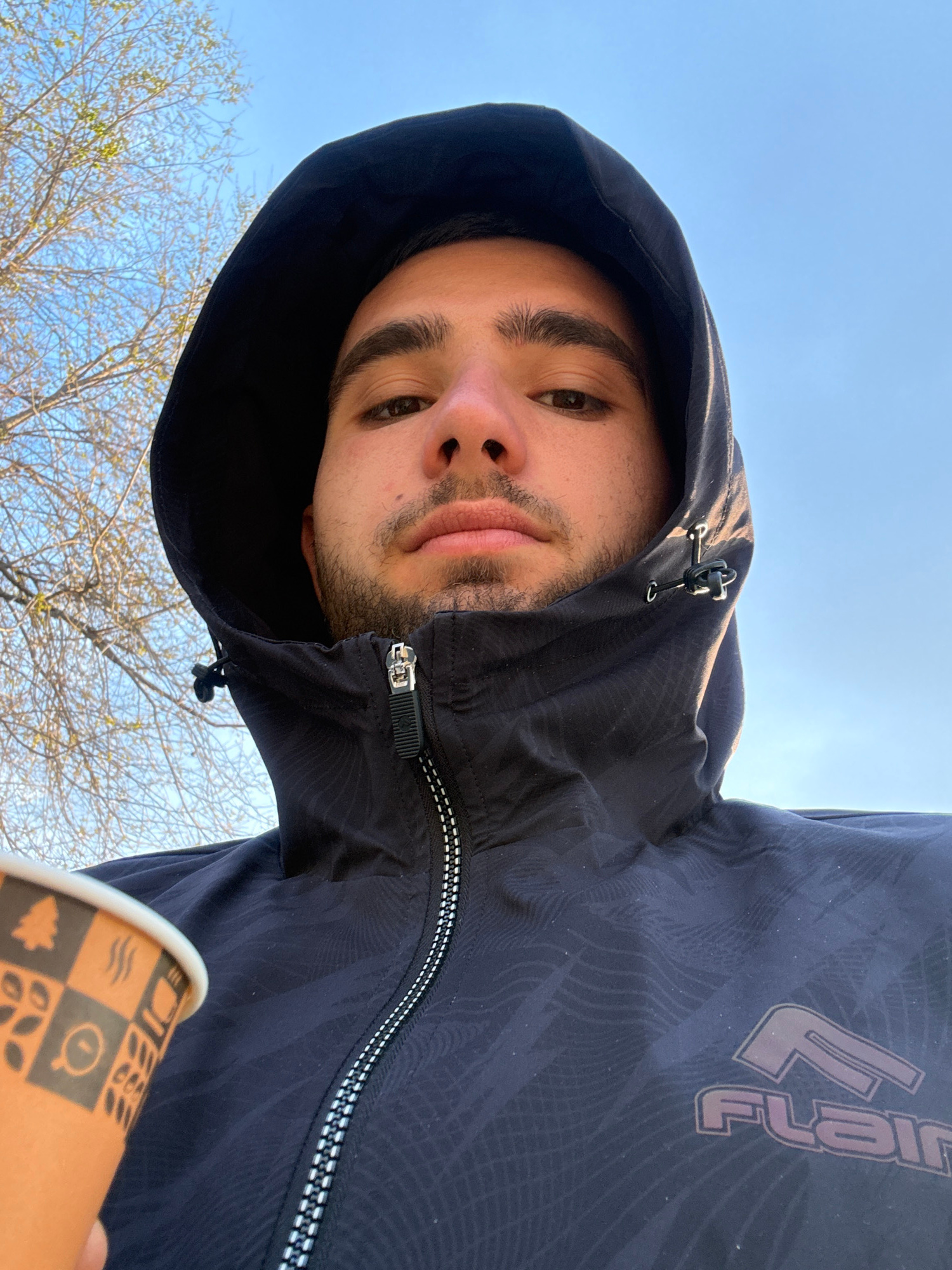 A man with a light complexion, dark hair, and a trimmed beard is looking down at the camera. He is wearing a black hooded jacket with a logo visible on the upper right. The jacket is zipped up. He is…read more