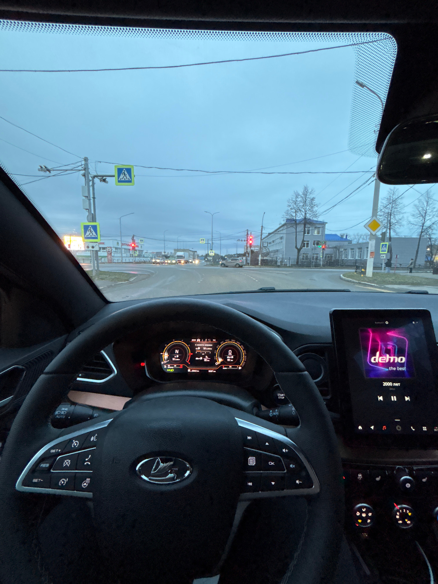 Here's a forensic description of the image: **Scene:** Interior of a vehicle, likely a car, looking through the windshield. The location appears to be an urban area, possibly Chaikovsky, Russia. **E…read more
