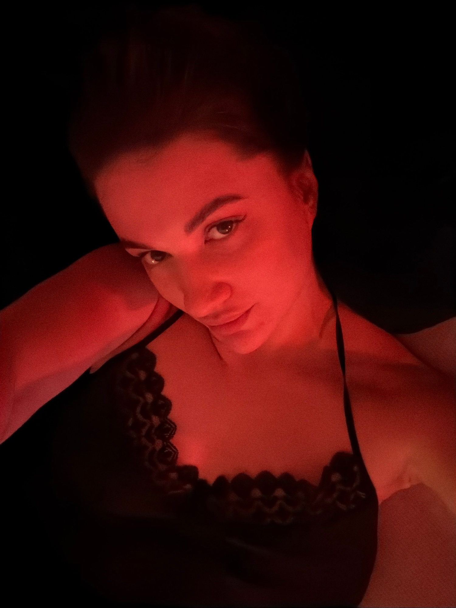 A woman is shown in an indoor setting under red lighting. She is wearing a dark top with lace trim around the neckline. Her face is angled towards the camera, with one eye visible and her head resting…read more