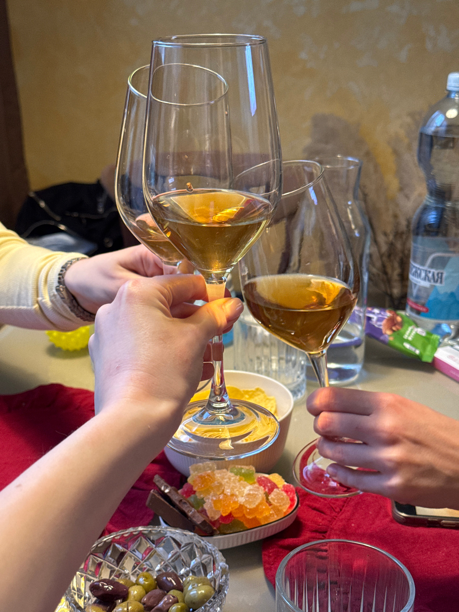 Two people are toasting with wine glasses filled with a golden liquid. A plate of gummy candies and chocolates, a bowl of olives, and a small bowl of chips sit nearby on a table covered with a red clo…read more