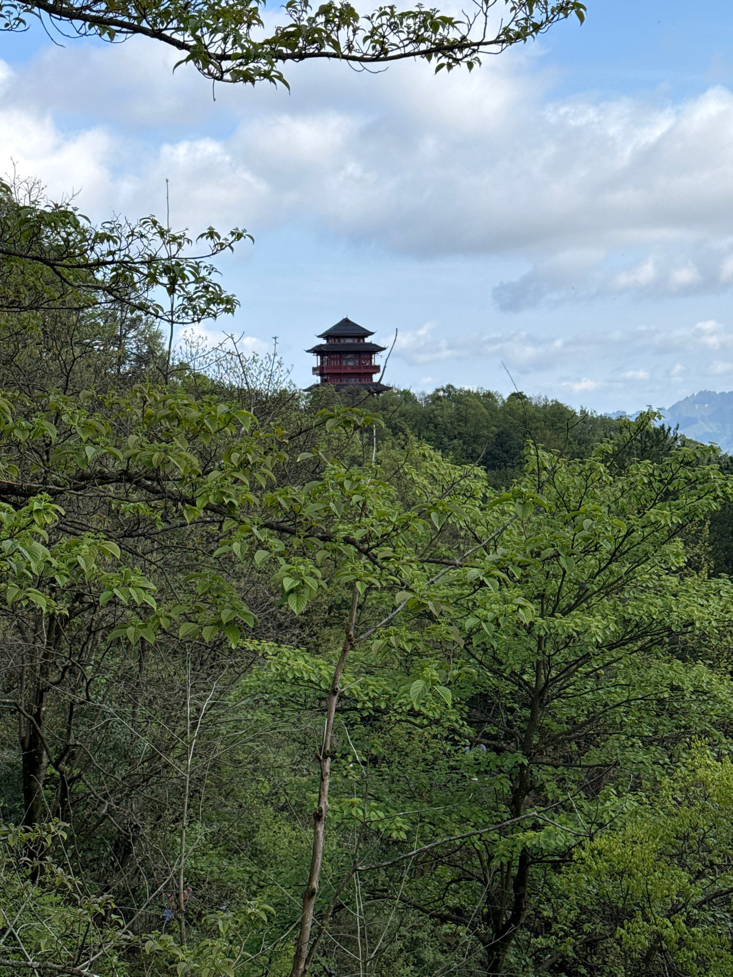 The image, taken in Wulingyuan, China, shows a pagoda-style building partially obscured by lush green trees. The structure, featuring a dark roof and red walls, sits on a hill, partially visible again…read more