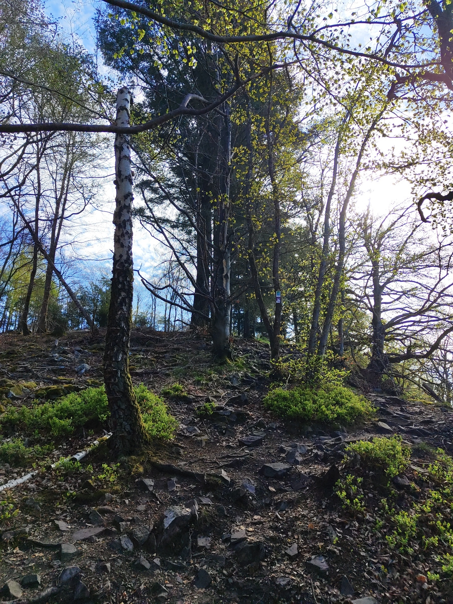 The image depicts a rocky slope in a wooded area, likely in Mettlach, Germany. The ground is covered with dark rocks and patches of green vegetation. Several trees with bare branches extend from the g…read more