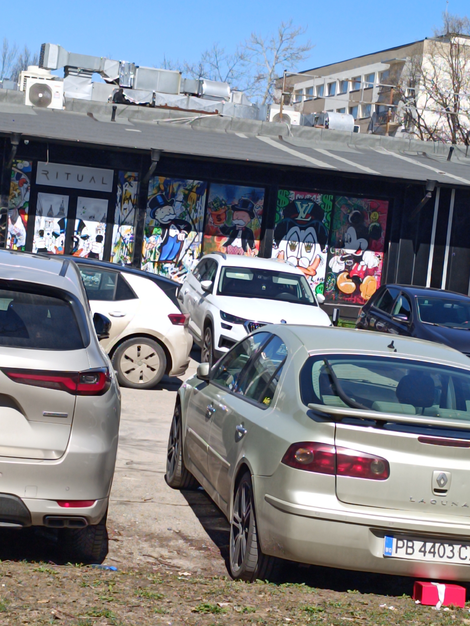 The image shows a street scene in Sofia, Bulgaria. Several cars are parked in front of a building with large, colorful murals depicting Monopoly and Mickey Mouse characters. The building has a sign re…read more
