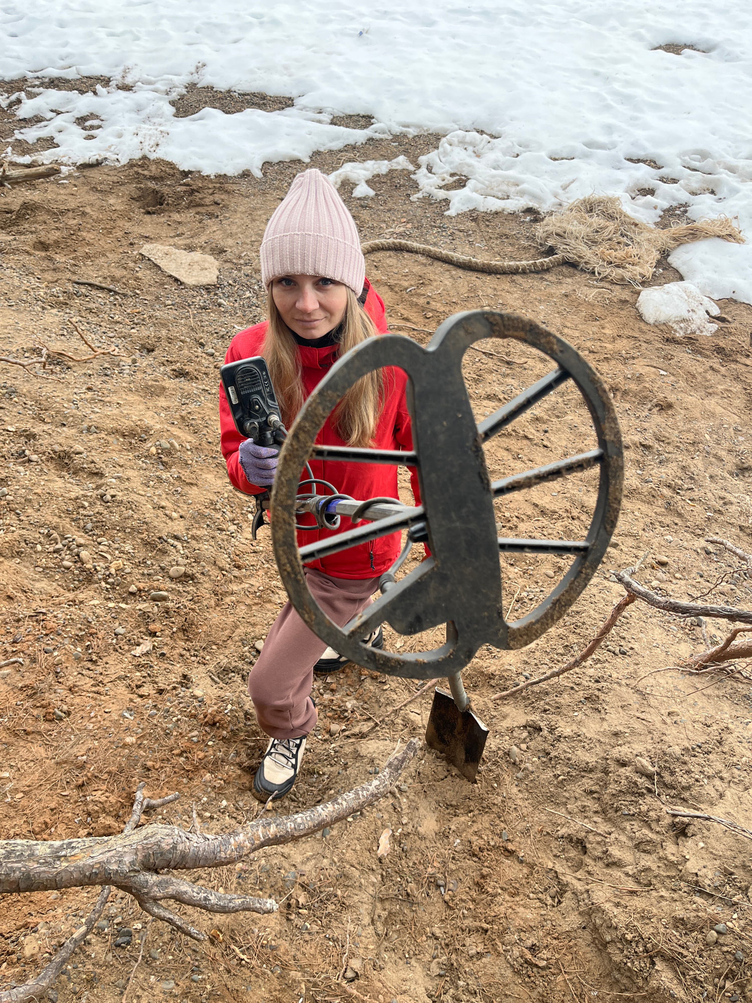 A young woman in a pink beanie, red jacket, and mauve pants holds a metal detector in a dirt and snow environment. She is smiling at the camera. To her right is a small shovel. The surrounding ground…read more