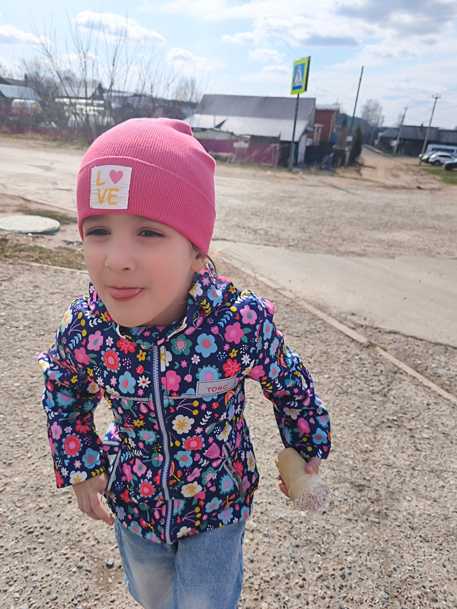 A young girl is captured outdoors, playfully sticking out her tongue. She is looking slightly upward and to the right, with a mischievous expression. She wears a pink knitted beanie with a white label…read more