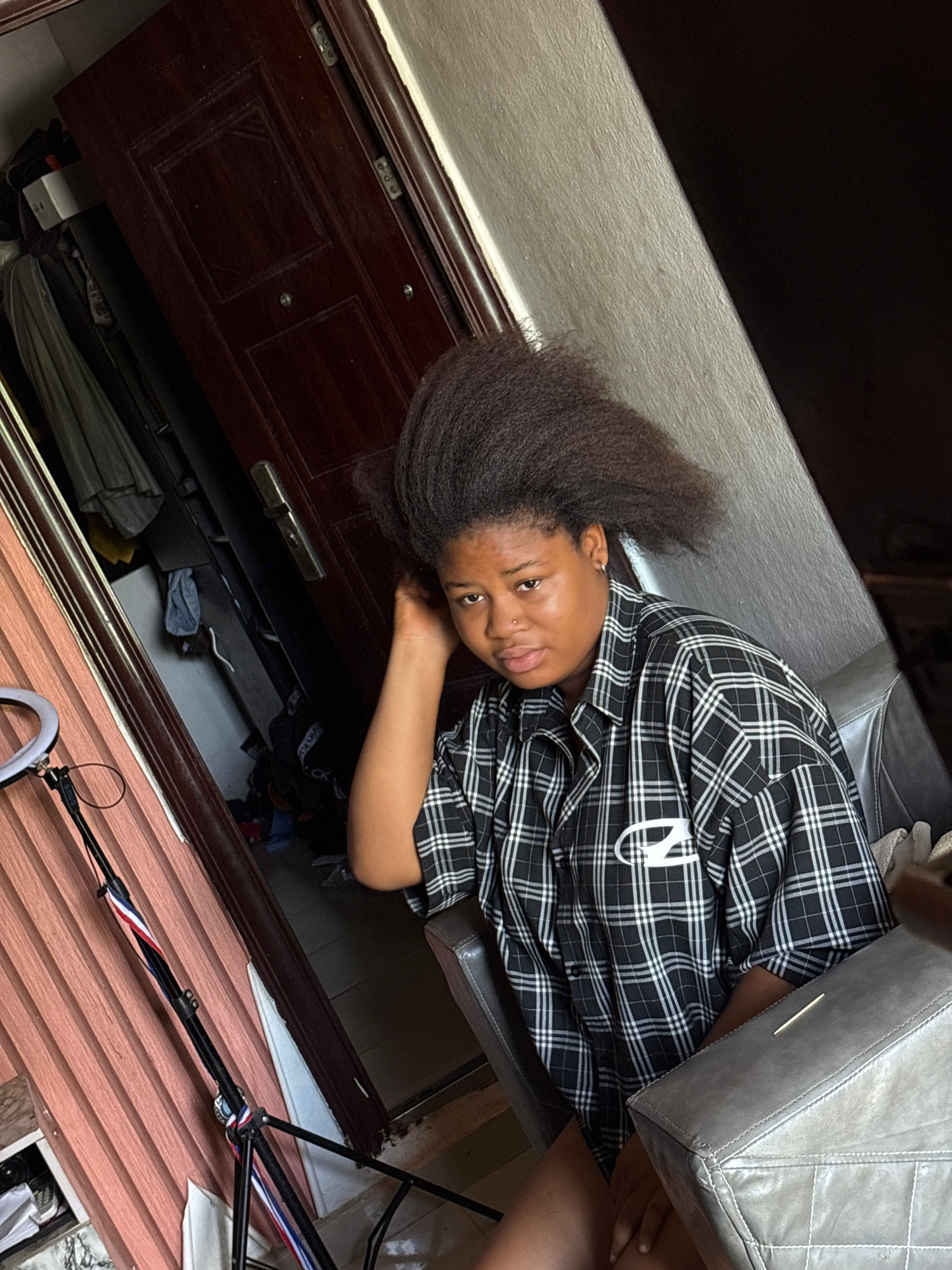 A young woman with dark brown hair and a black and white plaid shirt is sitting in a chair indoors. She is facing the camera and appears to be resting her arm on a dark wooden cabinet. A gray bag is p…read more
