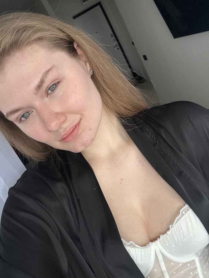 A woman with fair skin and blonde hair poses for a selfie. She is wearing a black satin robe that is partially open, revealing a white lace bra. Her expression is relaxed, and she is looking at the ca…read more