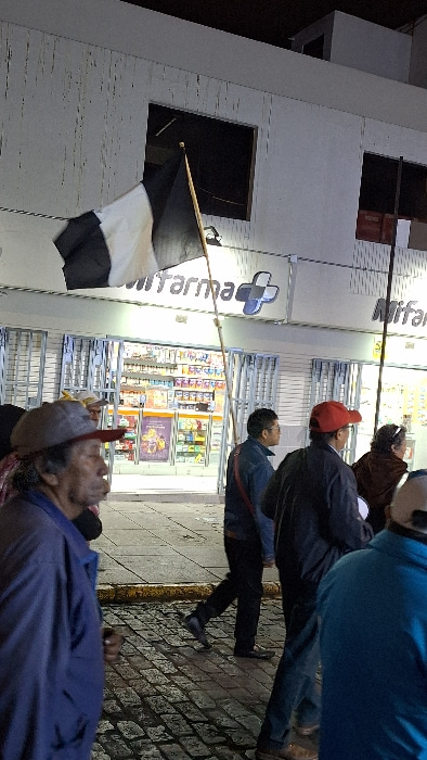A black and white flag stands near a building marked "Farmacia". A group of people are visible near the entrance, one wearing a red cap. A person lies on the ground in the foreground, appearing to be…read more