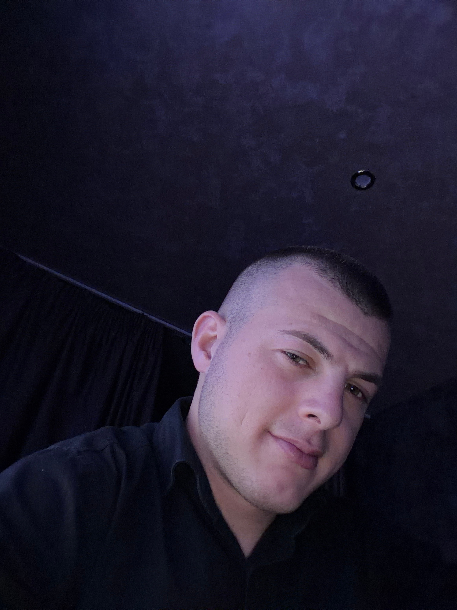 A low-angle selfie of a light-skinned male with a short military-style haircut. He is gazing down into the camera with a slight smile. He has dark eyes and stubble. He is wearing a dark-colored collar…read more