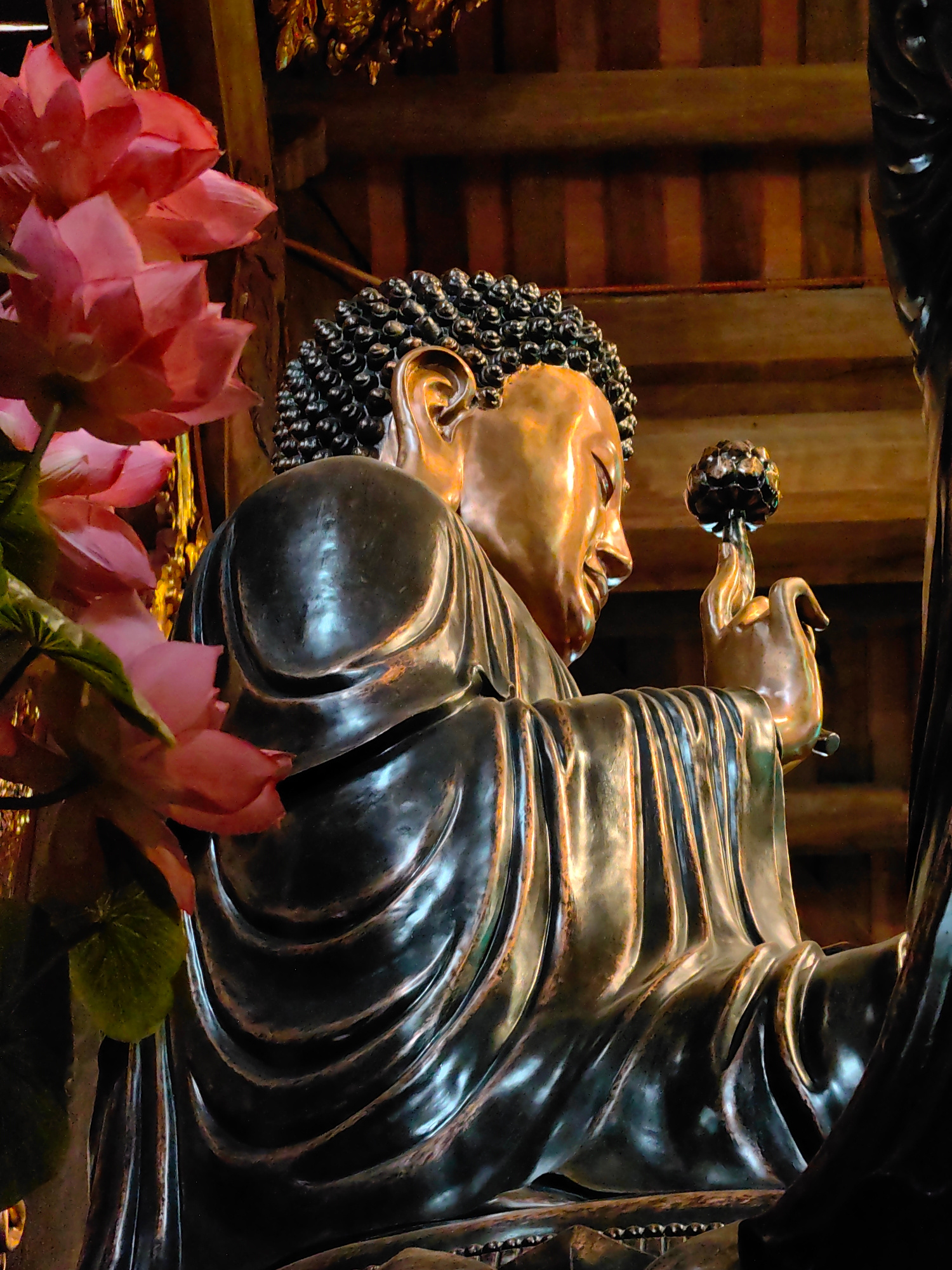 A statue of Buddha is positioned in Hong Gai Ward, Vietnam. The bronze-colored figure is holding a dark lotus flower bud. The head features tight, dark curls. A large arrangement of pink lotus flowers…read more