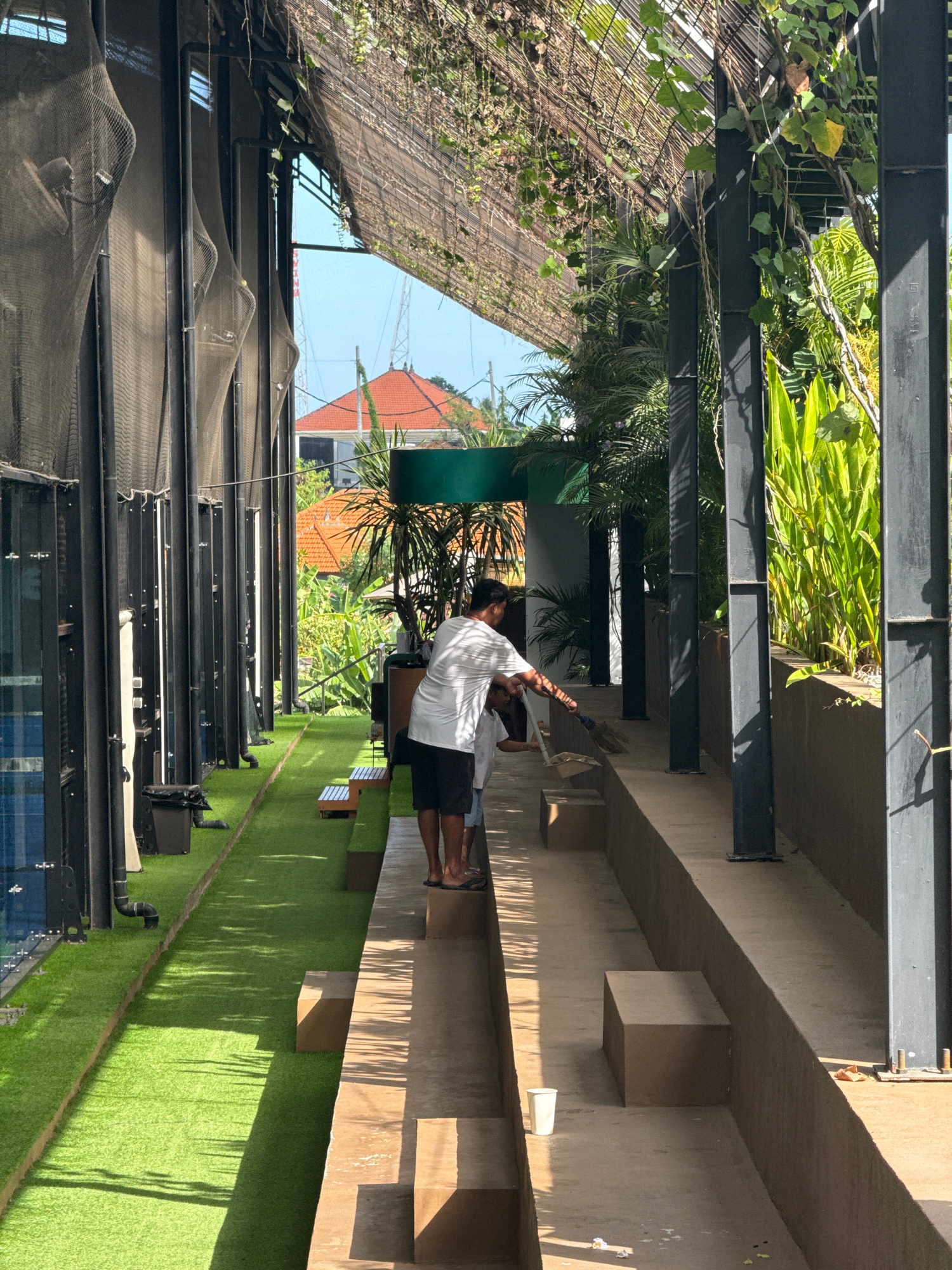 A man in a white shirt and black shorts is sweeping near a covered pool in North Kuta, Indonesia. A second person is visible behind the sweeper. The pool covering is semi-transparent, and there are ho…read more