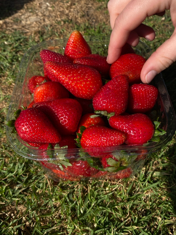 A close-up photograph depicts a clear plastic container filled with approximately two dozen bright red strawberries, some retaining their green calyxes. A human right hand, with fair skin, is partiall…read more