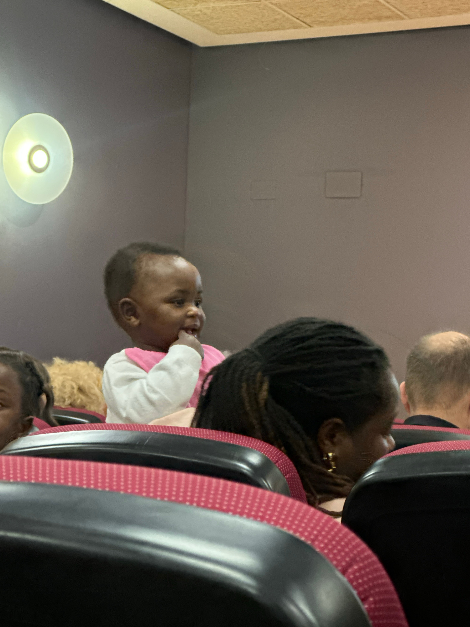The image shows a baby with dark skin and short, dark hair, wearing a white and pink shirt. The baby is sitting in a seat on a train or bus, as suggested by the presence of other people, seatbacks wit…read more