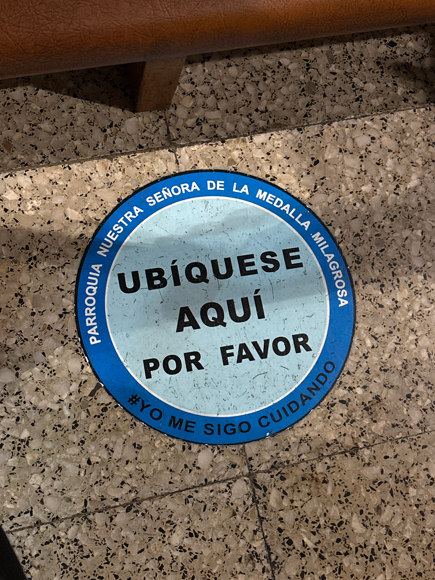 The image shows a circular floor sticker adhered to a terrazzo floor. The sticker has a blue border and a light blue center. Spanish text is printed on the sticker. Around the perimeter it reads "PARR…read more
