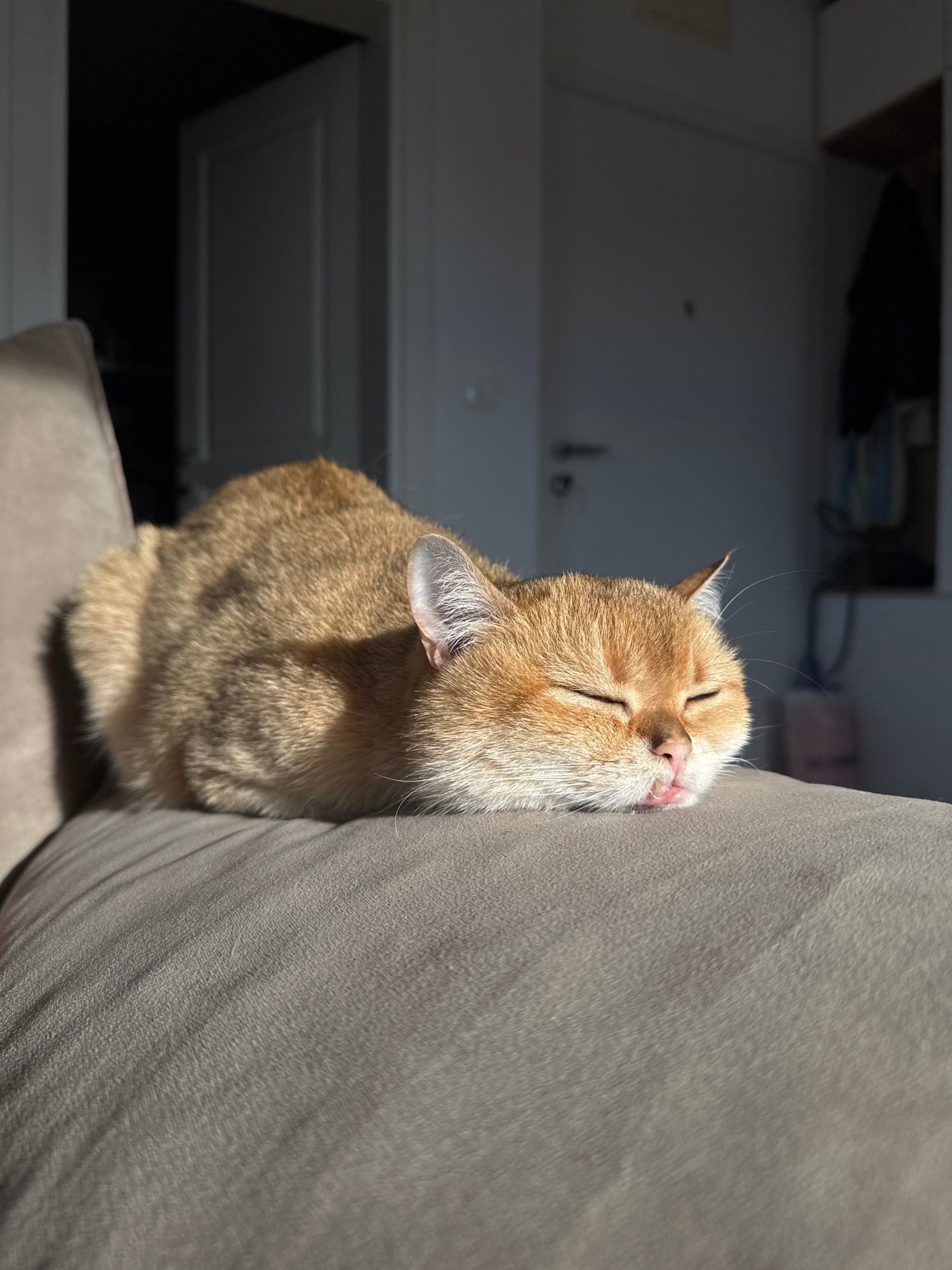 A golden British Shorthair cat is asleep with its face pressed into a gray sofa. The cat is sitting on the sofa. Part of a cabinet or wall is visible in the background. The location is not discernible…read more