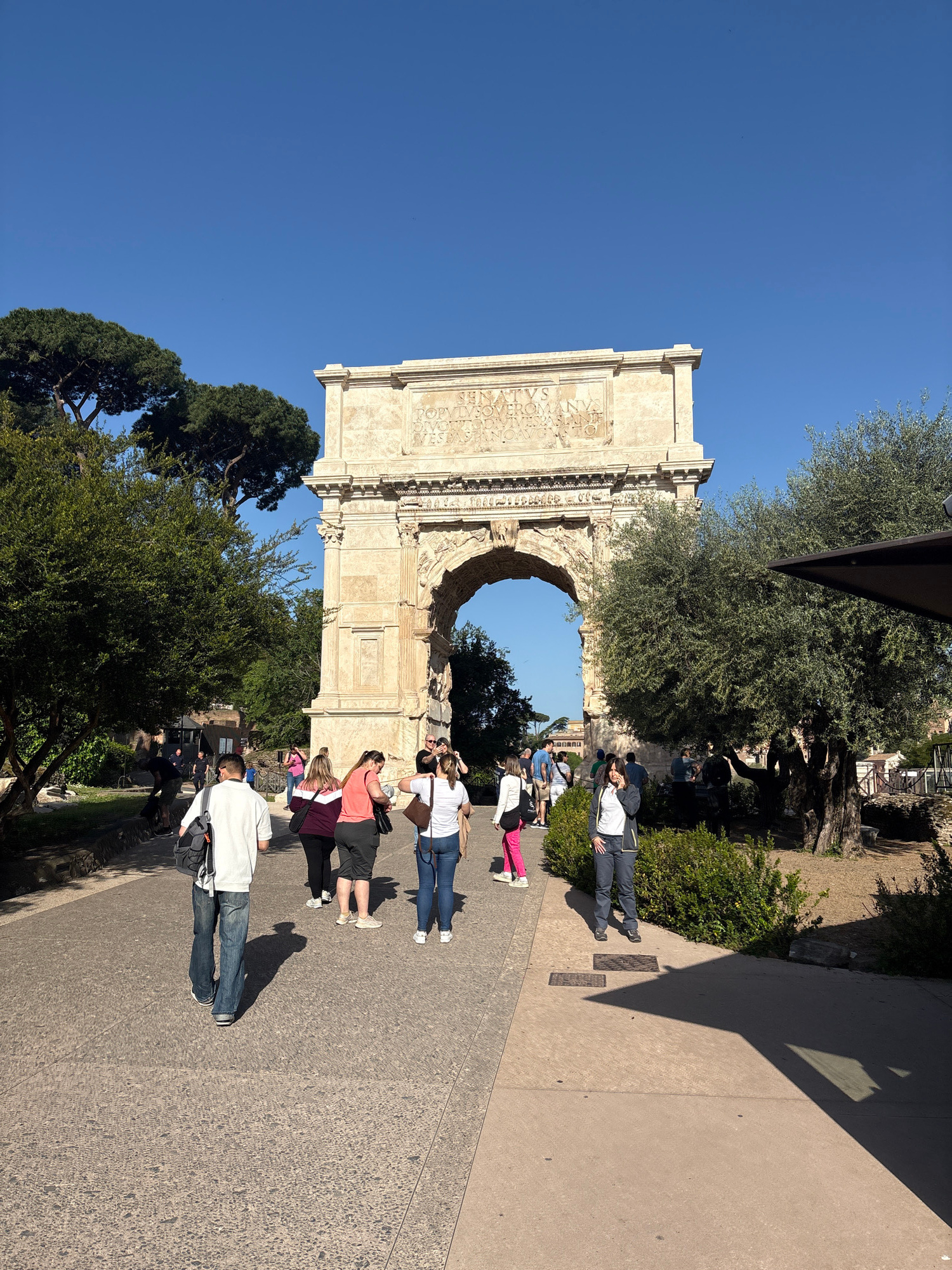 The image displays the Arch of Titus, a well-preserved Roman triumphal arch, under a clear, bright blue sky in Rome, Italy. The arch, made of light-colored stone, features detailed relief carvings and…read more