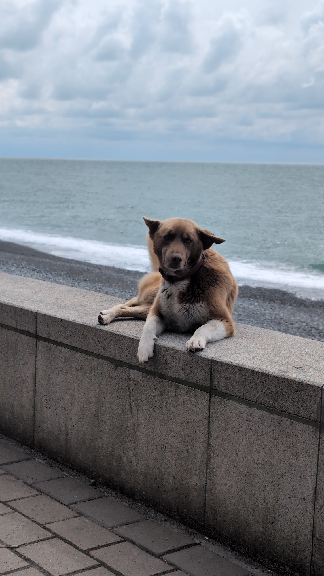 A medium-sized, tan-colored dog with white paws and chest rests on a concrete ledge next to a beach. The dog is looking towards the viewer with its head tilted. The background shows a pebble beach wit…read more