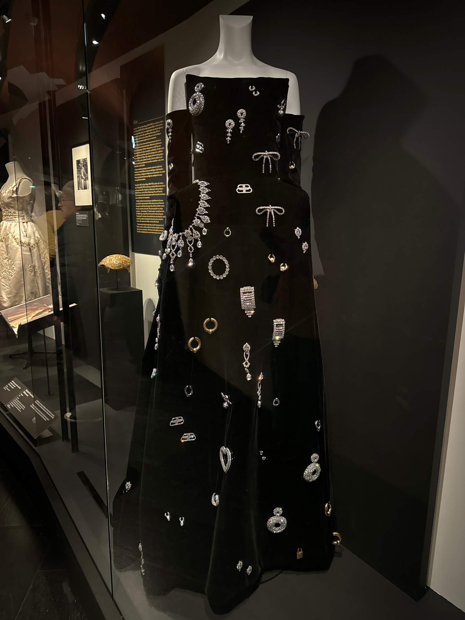 A black dress embellished with various jewelry pieces is displayed on a mannequin in a glass case, presumably in a museum exhibit. The jewelry includes diamonds, gold pieces, and a rhinestone-like cro…read more