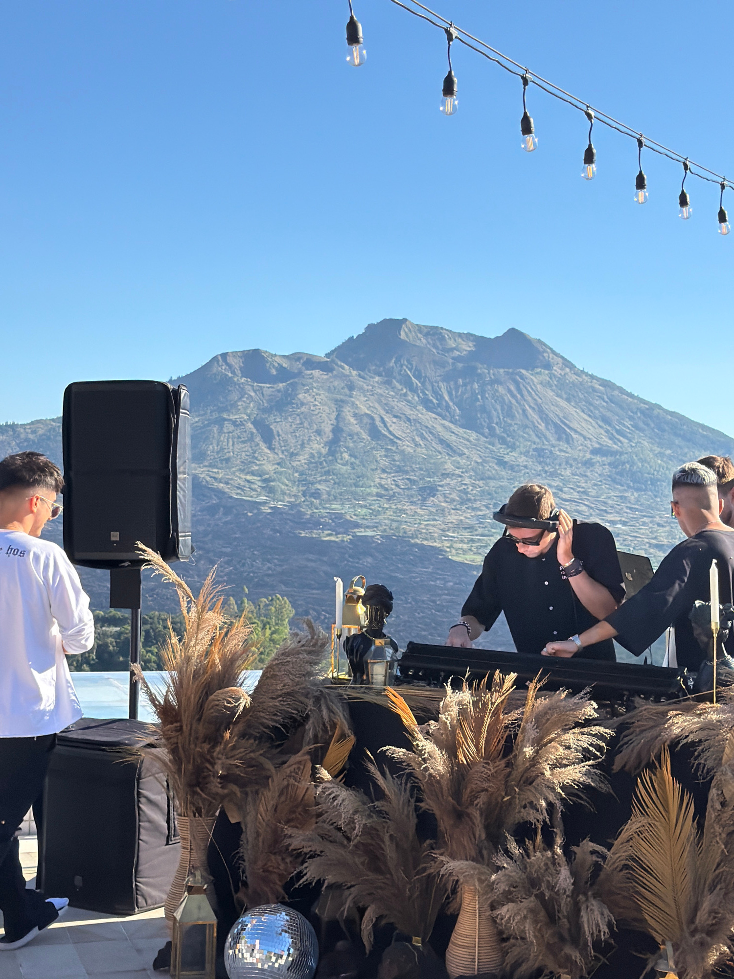 The image depicts an outdoor event setup against a backdrop of a mountain landscape, likely in the Kedisan area of Indonesia. In the foreground, there is a person wearing a white shirt. To the left, a…read more