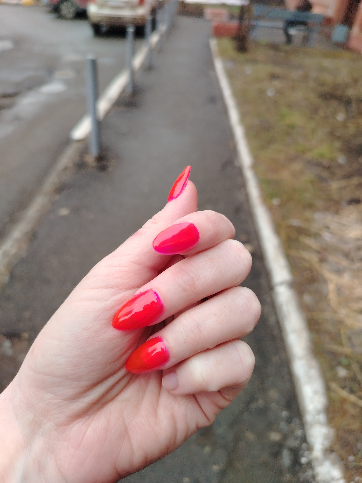 A close-up shot captures a woman's hand with bright red, glossy nail polish. The nails are filed into a long, pointed shape. The background is a blurred cityscape. The ground appears to be wet asphaltβ¦read more