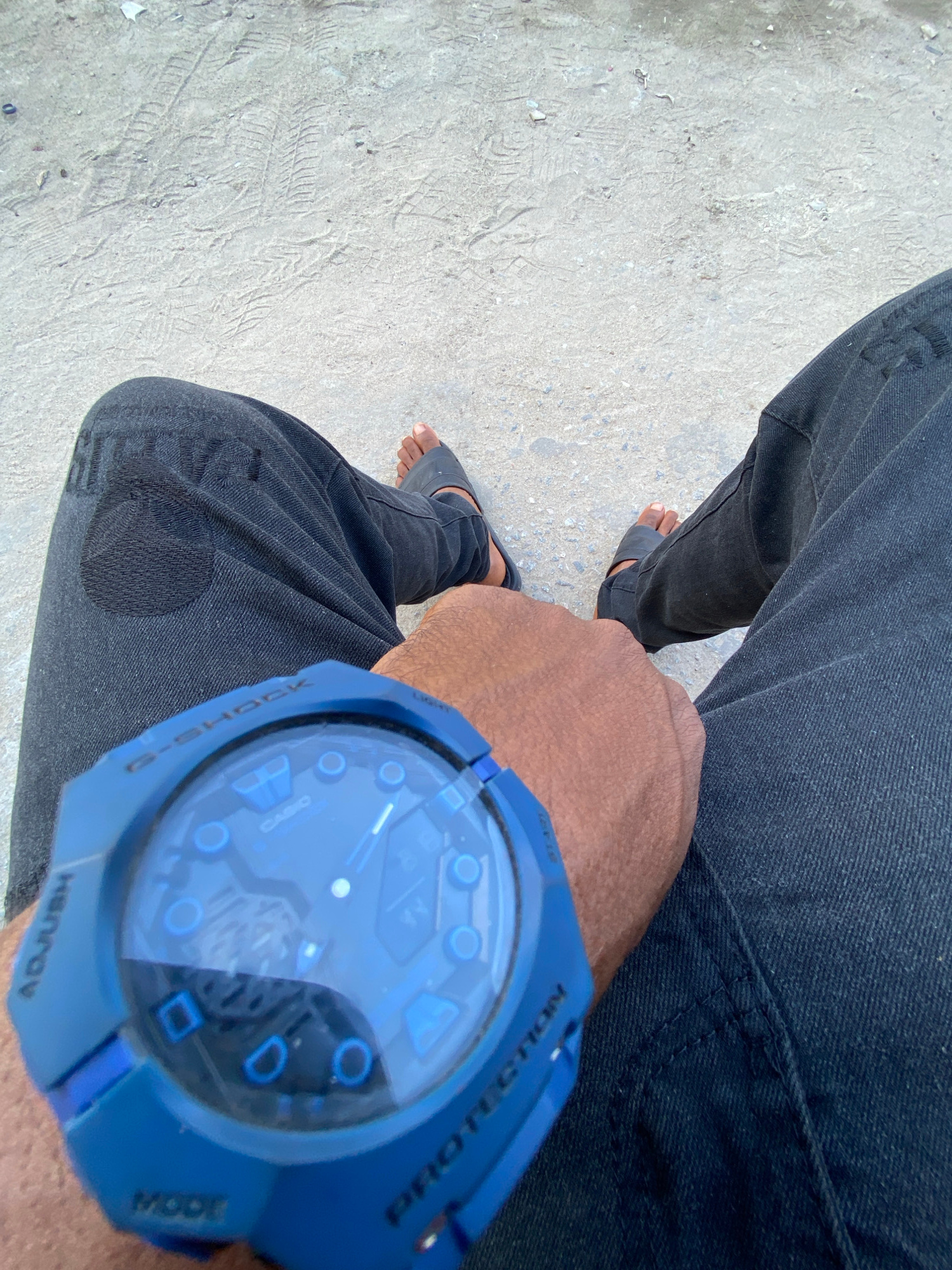A person stands on a concrete surface, likely a sidewalk, in Ado, Nigeria. They are wearing black jeans and grey flip-flops. On their left wrist is a large, blue Casio G-Shock wristwatch. The watch fa…read more