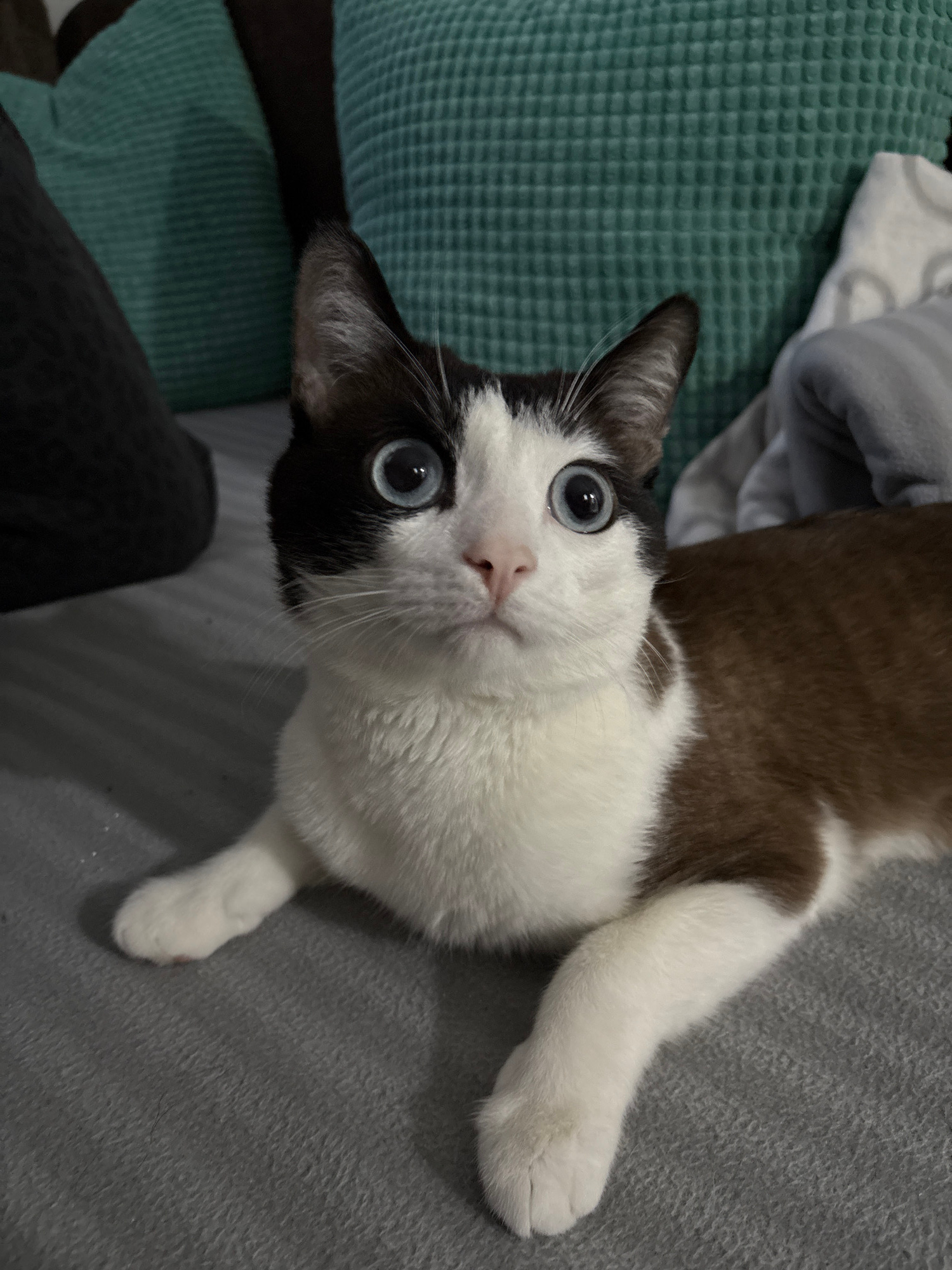 A cat with white and brown fur is laying on a gray blanket, looking up with wide blue eyes. The cat has a white face with brown markings around its ears and on top of its head. Its body is primarily w…read more