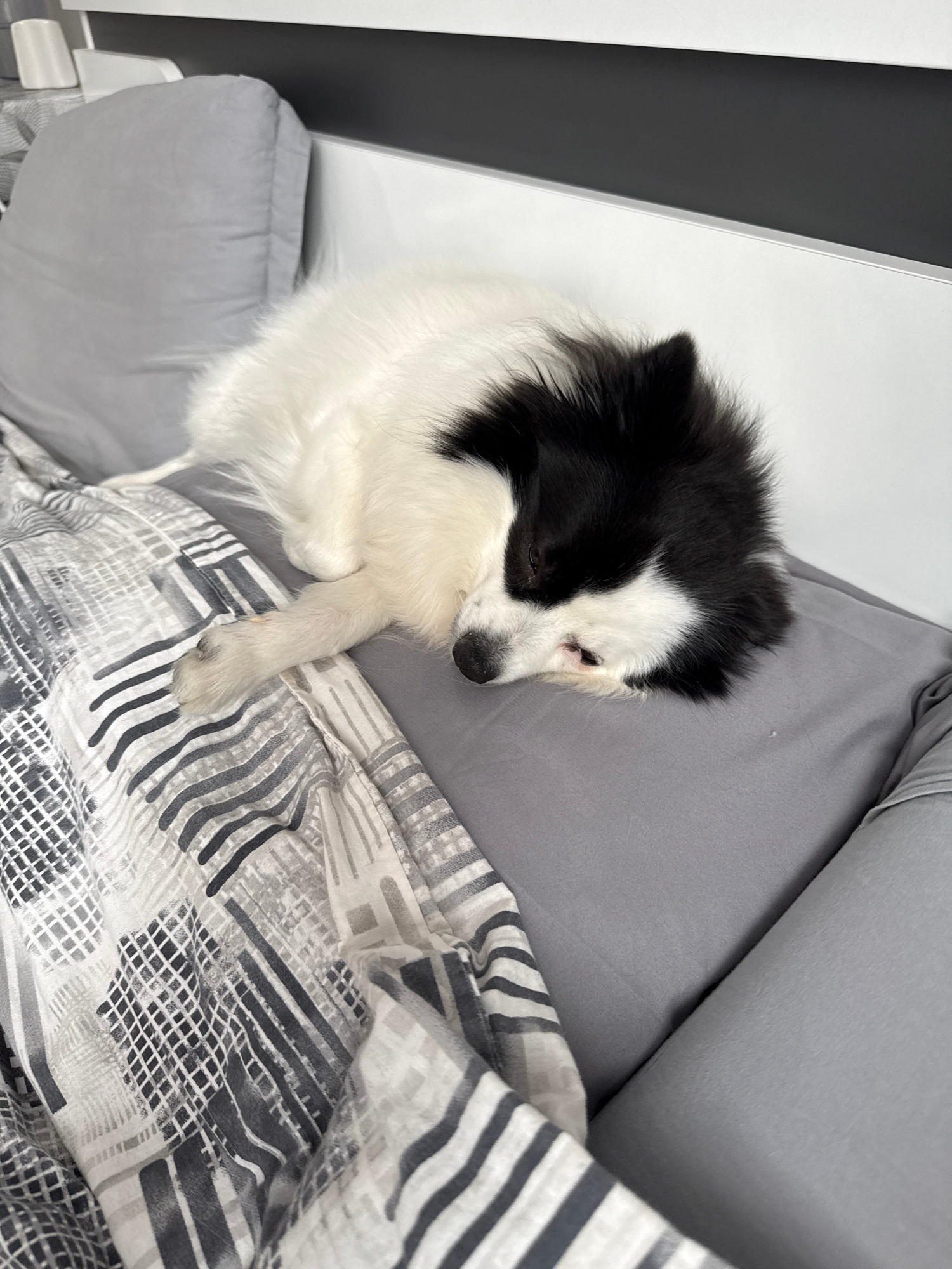 A black and white dog is curled up on a gray bed with patterned bedding in an indoor setting. The background includes a gray and white wall. The location is not discernible from the given image.