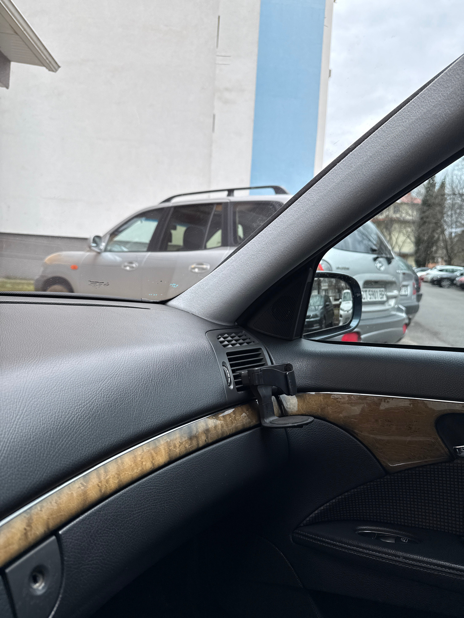 The image shows the interior of a car, specifically the driver's side door panel and a view through the front window. The door panel is a mix of gray plastic, wood trim, and black leather. An air vent…read more