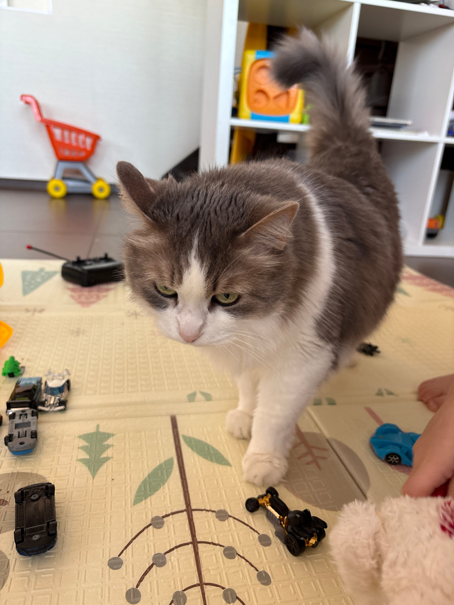 A gray and white cat lies on a patterned playmat. The mat is covered with toy cars and a stuffed animal. A white shelf unit is visible in the background, with toys and other items inside. A child's ha…read more