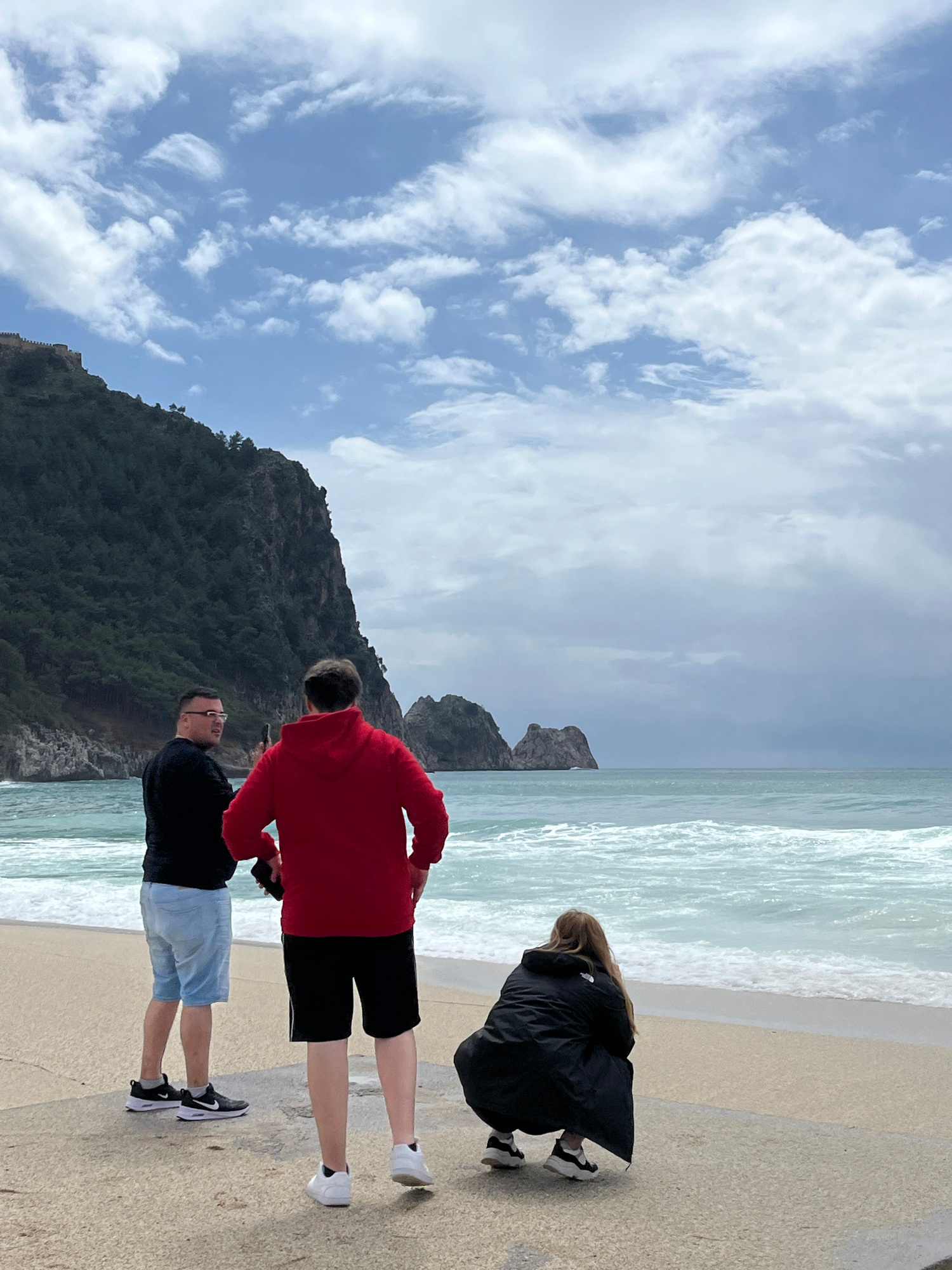 On a beach in Alanya, Turkey, three people are positioned. The foreground features a man in a black shirt and light blue shorts, standing next to a man in a red sweatshirt and black shorts. In the bac…read more