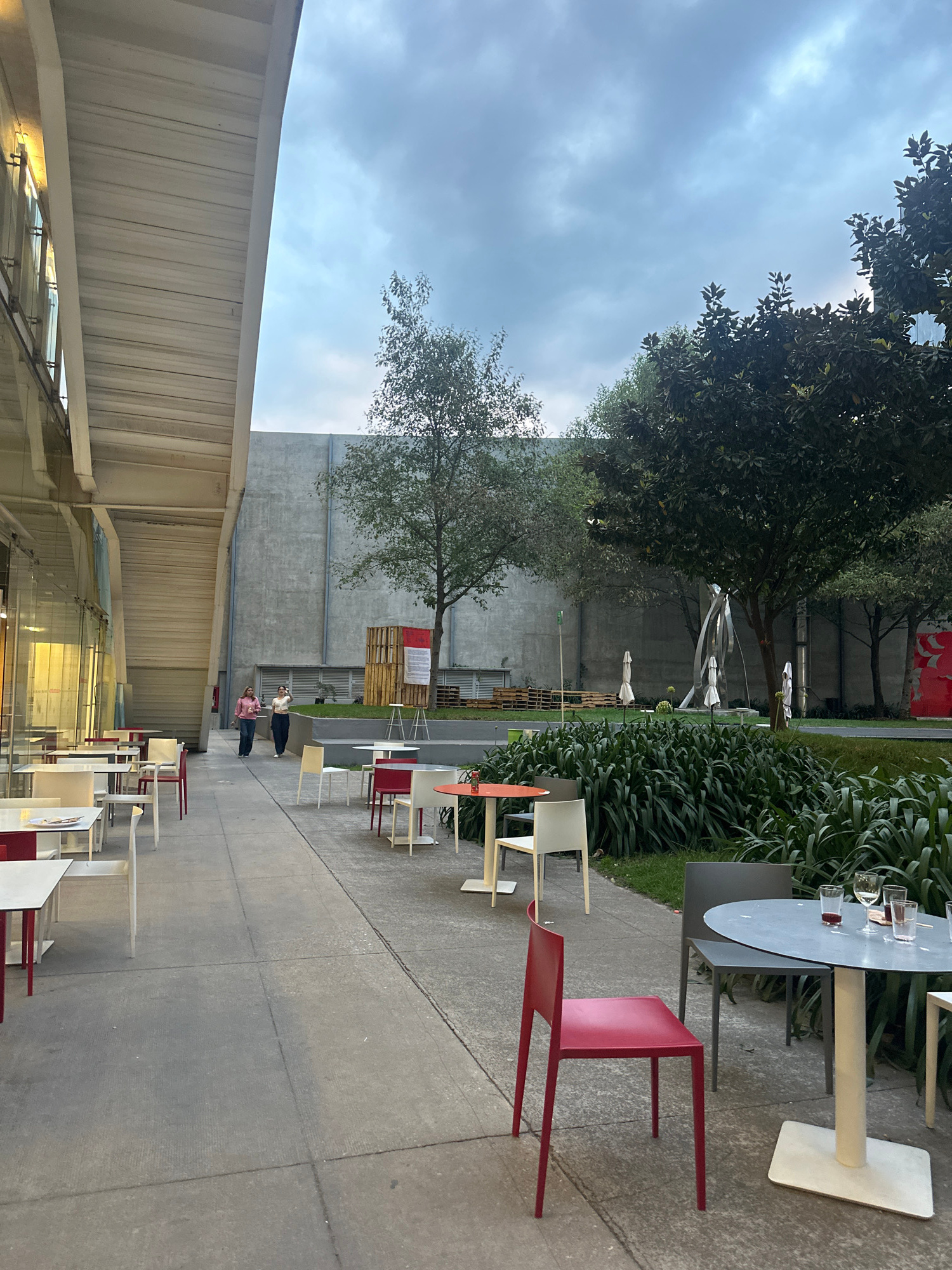 This image depicts an outdoor seating area, likely a cafe or restaurant, situated alongside a modern architectural building under an overcast sky. The scene is captured from a slightly elevated perspe…read more