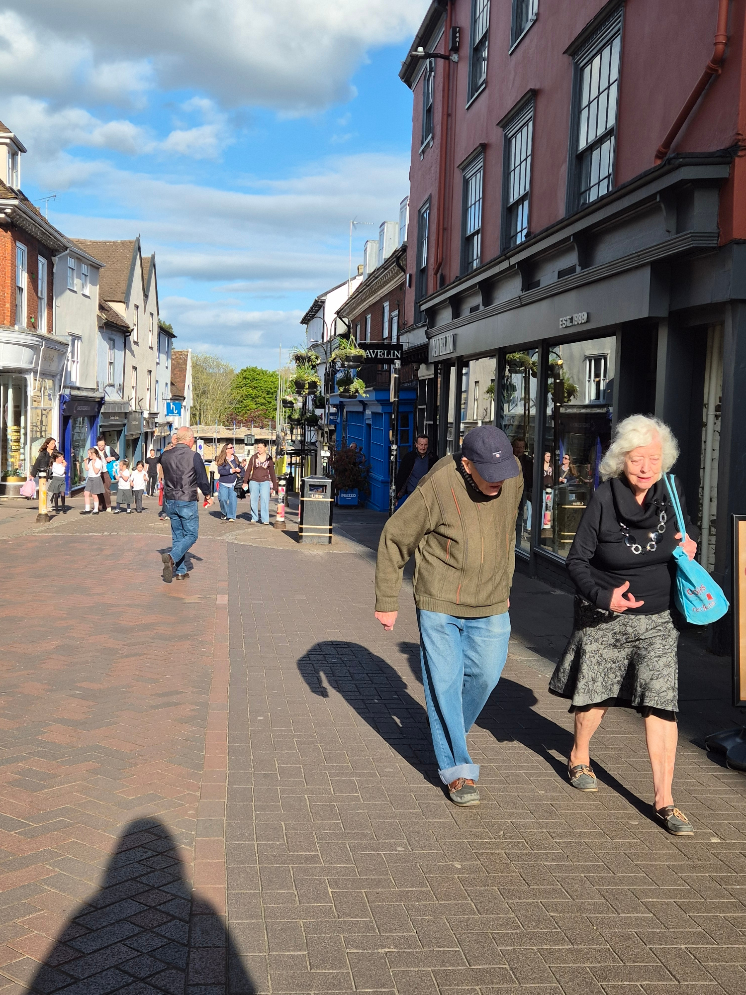 The image shows a street scene in West Suffolk, United Kingdom, likely a pedestrianized area. Two people, an elderly woman with white hair and a younger man in a blue baseball cap, stand on a brick-pa…read more