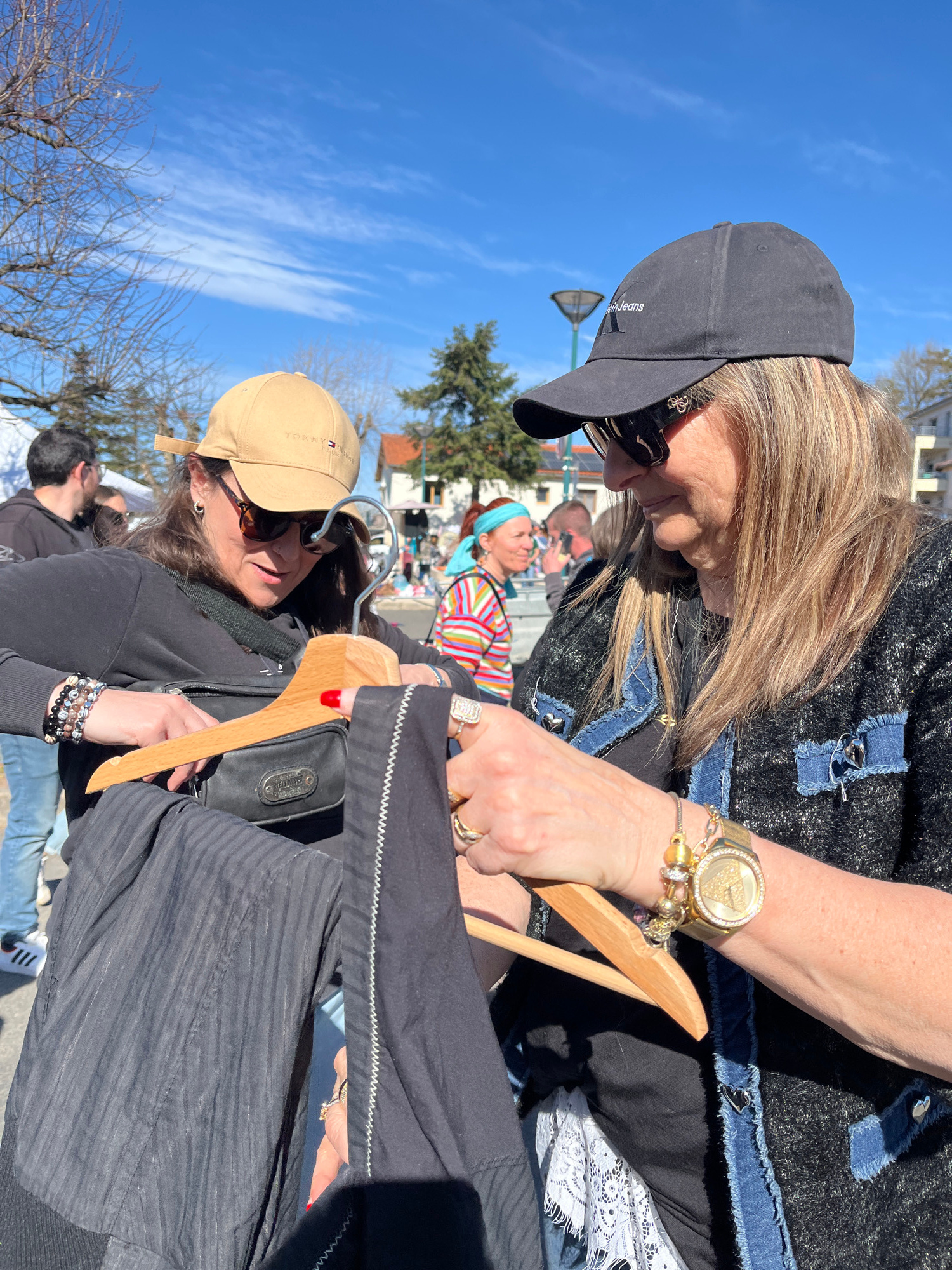 Two women examine clothing at an outdoor market on a sunny day in Bellegarde-en-Forez, France. One woman, wearing a black jacket with denim trim, a gold watch, and a black baseball cap, holds a wooden…read more