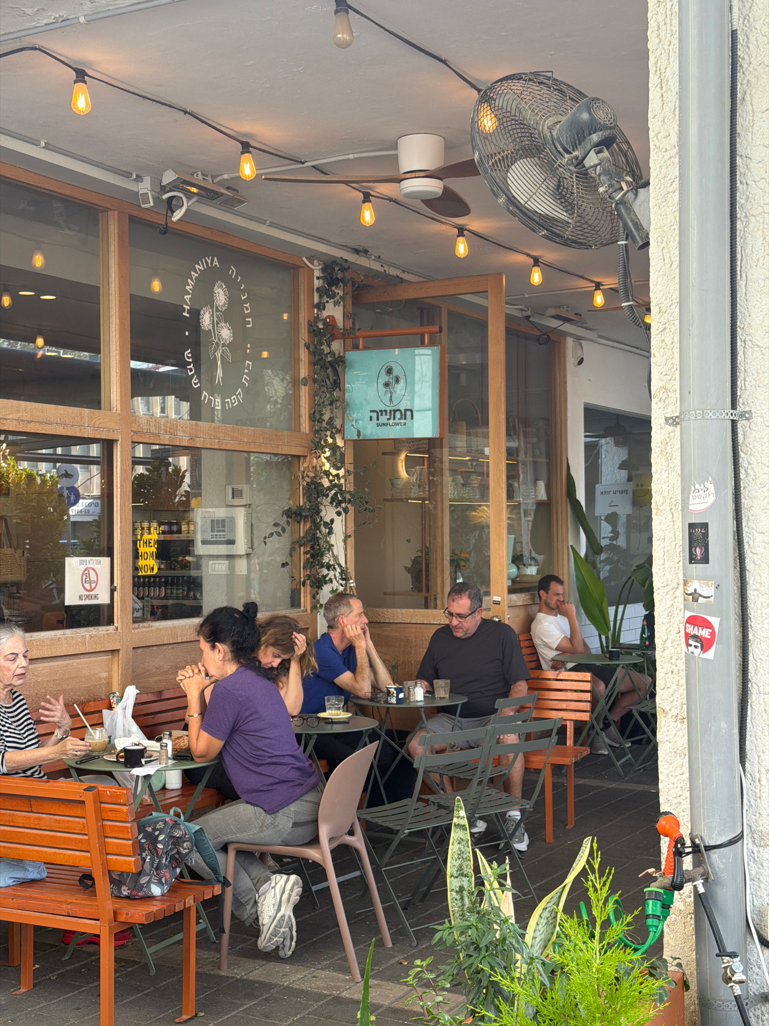The image depicts the exterior seating area of a cafe in Tel-Aviv, Israel. A group of people are seated at various tables, engaged in conversation and dining. The cafe's facade features large windows…read more