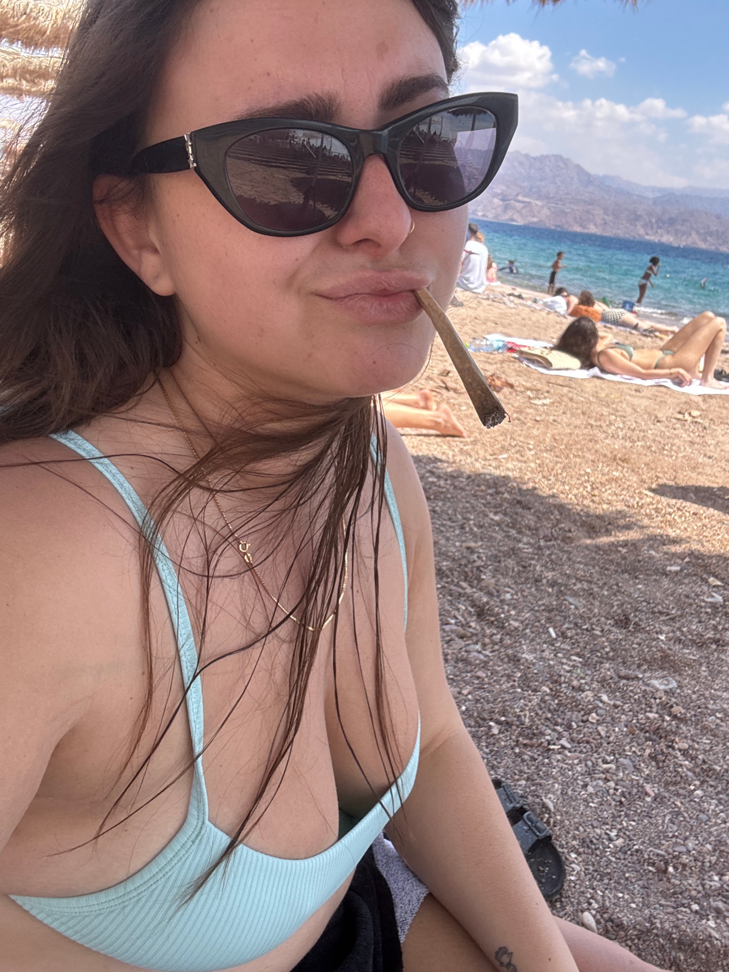 The image displays an outdoor scene on a pebbly beach in Eilat, Israel. In the foreground, a female subject, appearing to be an adult in her 20s or 30s, is seated, angled slightly to the right. She has long, dark, partially wet hair and wears a light blue ribbed bikini top and black cat-eye sunglasses. A small nose ring is visible on her left nostril. She holds a hand-rolled cigarette, which has a dark ash tip, between her pursed lips. A thin, gold-colored chain necklace is visible on her chest, and a small, indistinct tattoo is present on her right forearm. A black sandal lies on the ground near her. The midground features several other individuals on the beach and in the clear, turquoise-blue water of the Red Sea. One person in a dark bikini is sunbathing on a white towel, while others are standing or swimming in the water. A plastic bottle is visible on the sand near the sunbather. In the far background, arid, reddish-brown mountains rise under a blue sky with scattered white clouds. A thatched structure, likely an umbrella or awning, is partially visible in the upper left corner of the frame. | Open Wire