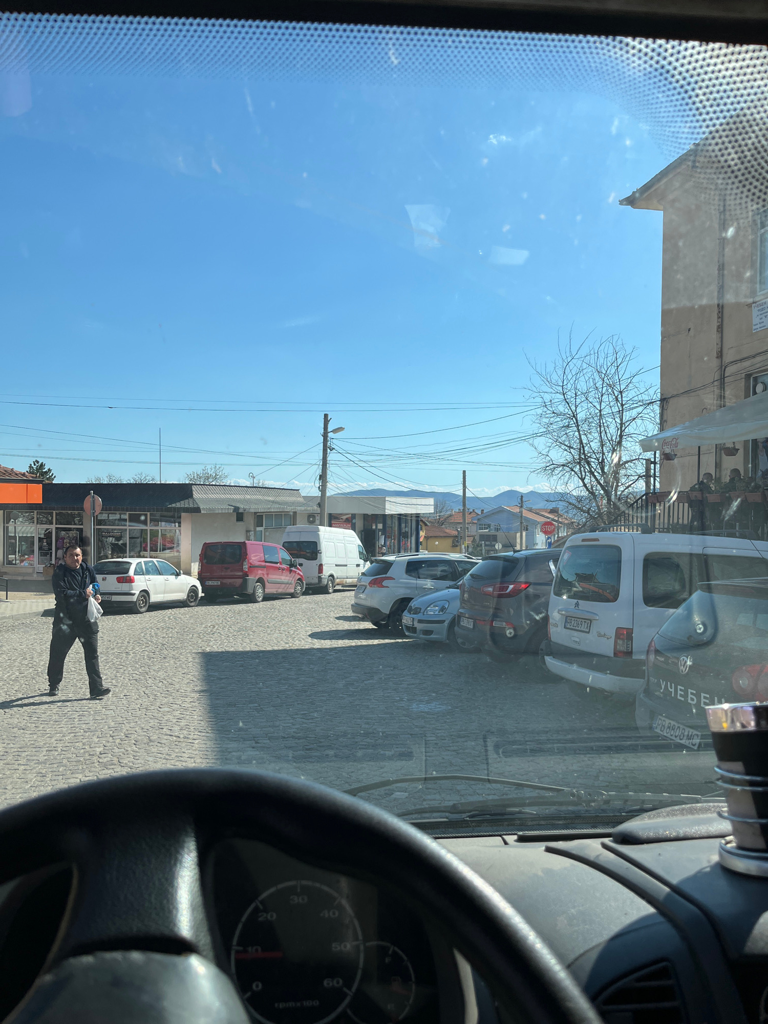 A photograph taken from the interior of a vehicle shows a street scene in Karlovo, Bulgaria. The vehicle's steering wheel and dashboard partially obscure the view. Outside, several cars and vans are parked along the right side of the road. A man is walking on the sidewalk. A building with shops is behind him. In the distance, mountains are visible under a clear blue sky. There are stop signs and utility poles present. Vehicle license plates are partially visible, including "PB 2369 TX" and "PB 8808 MC." | Open Wire