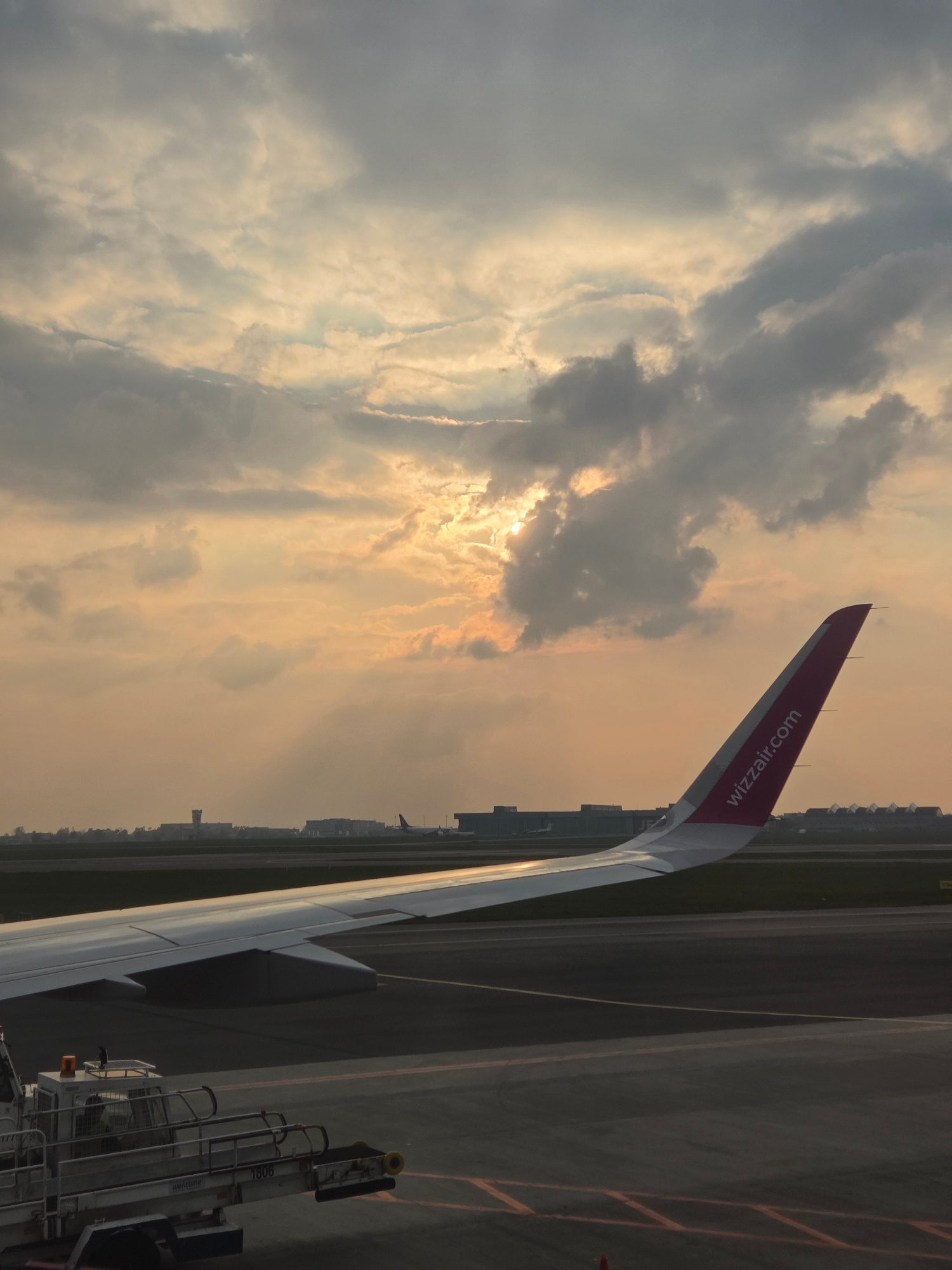 The image shows the wing of a Wizzair aircraft at an airport. The tail of the plane is visible in the frame. The sky is filled with clouds with the sun shining through. An airport is visible in the ba…read more