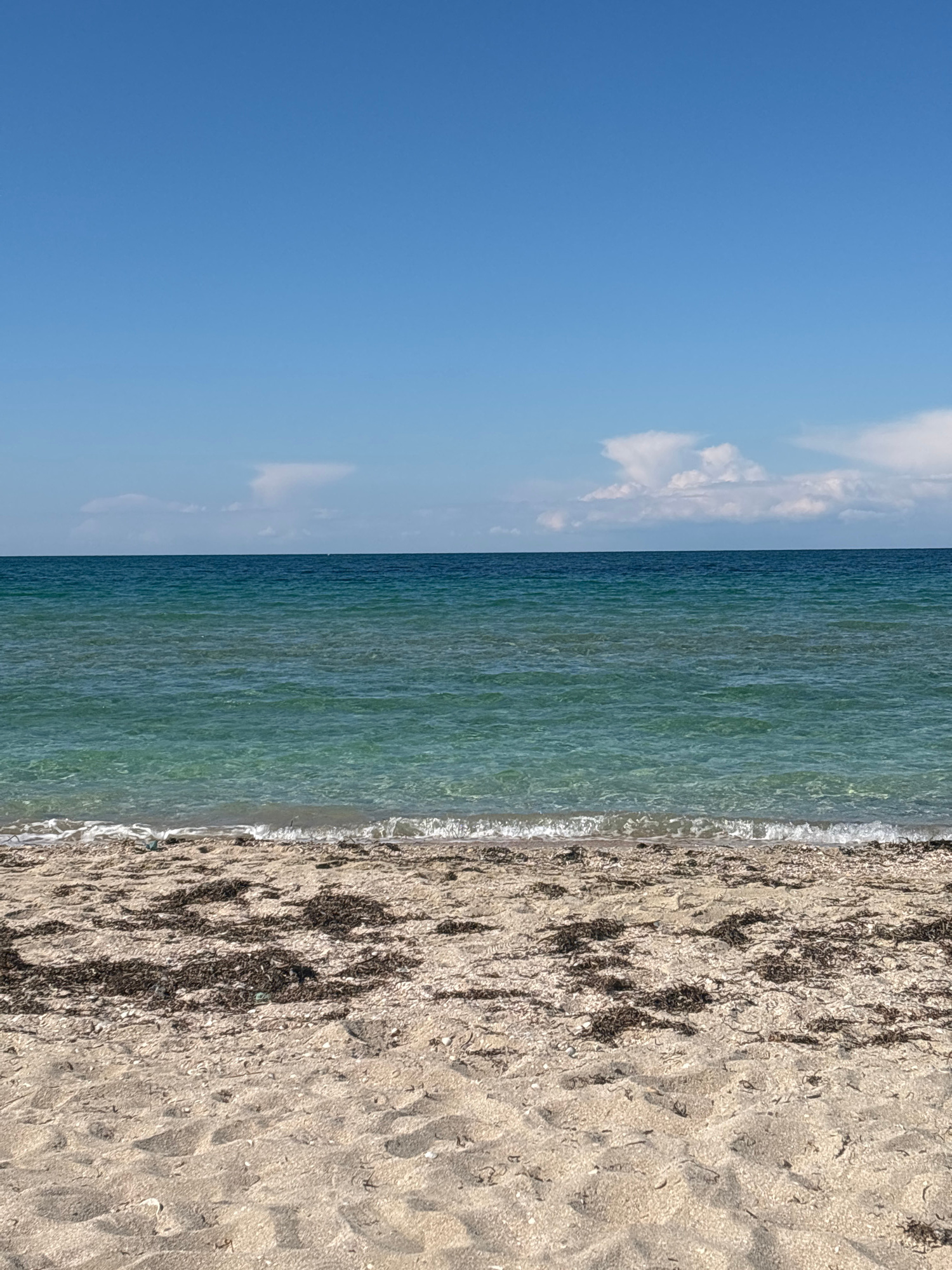 The image shows a beach scene in Chornomorskoe, Ukraine. The photograph is vertically oriented. The left portion of the image displays a clear blue sky with a few white clouds. The central portion sho…read more